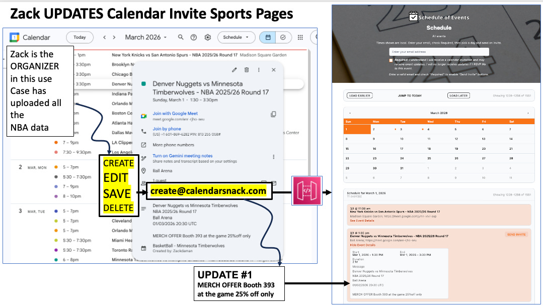 In the demo, our organizer Zach EDITS the Original Calendar Invite and UPDATES the Message Body with a “MERCH OFFER Booth 393 at the game 25% off only” message for the Denver vs. Timberwolves game, and SAVES in the Calendar Client.