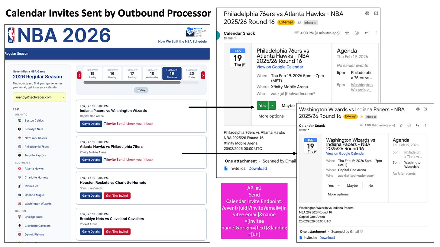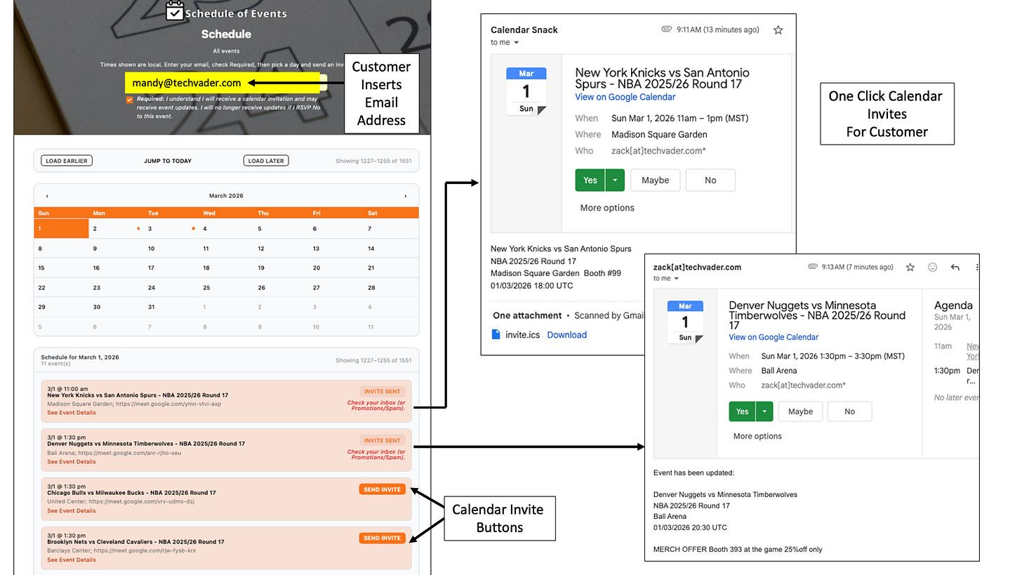 In this use case, when a customer enters their email address in the email field on the Sports Event Page and clicks a button, they receive a calendar invite for an NBA game.