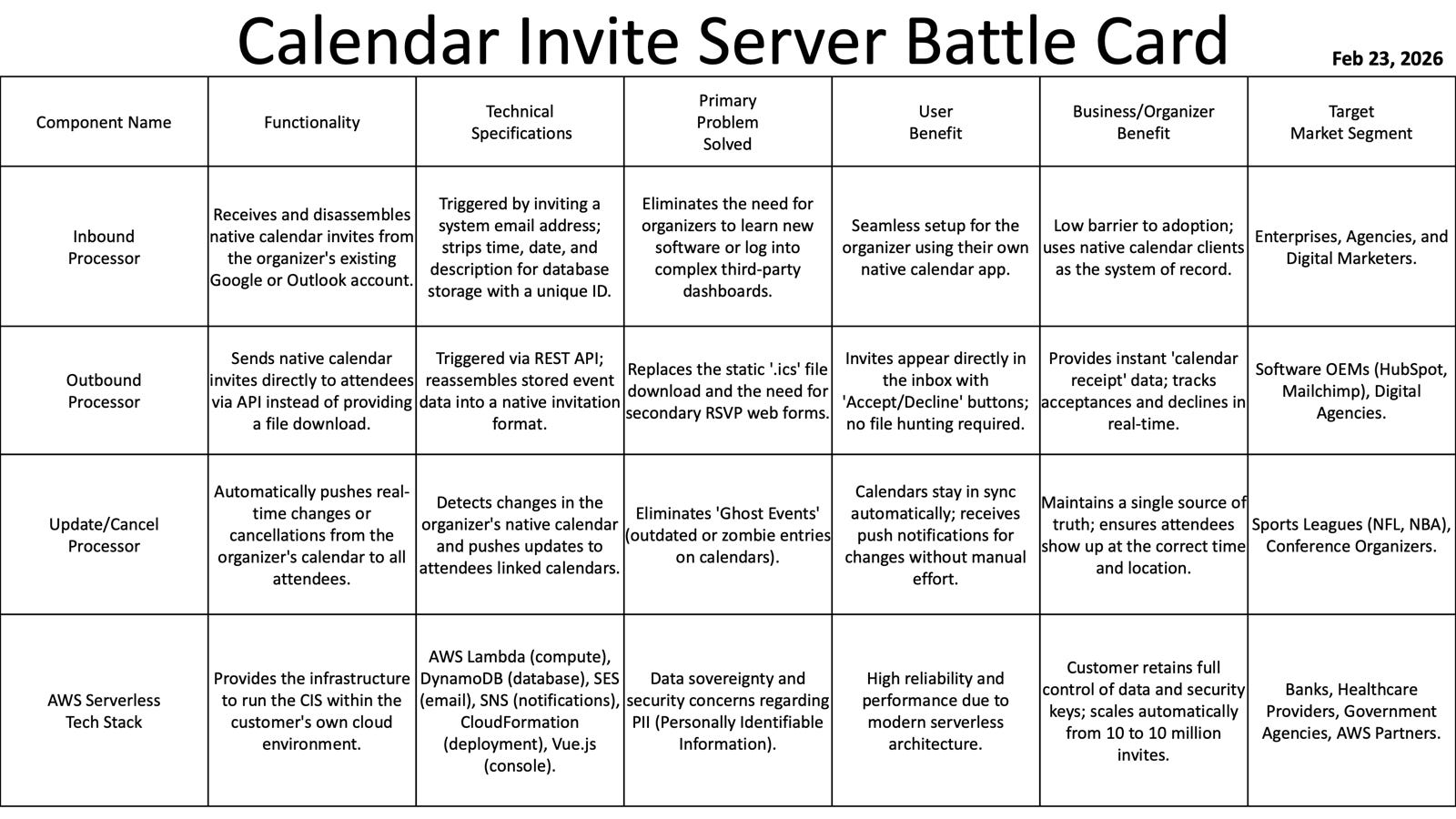 The tech stack is ready to be installed in any one of the millions of AWS accounts using a CloudFormation template that deploys the CI/CD pipeline for the Front End GUI, which is wired to the Back End (BE) Calendar Invite Server on AWS services.
