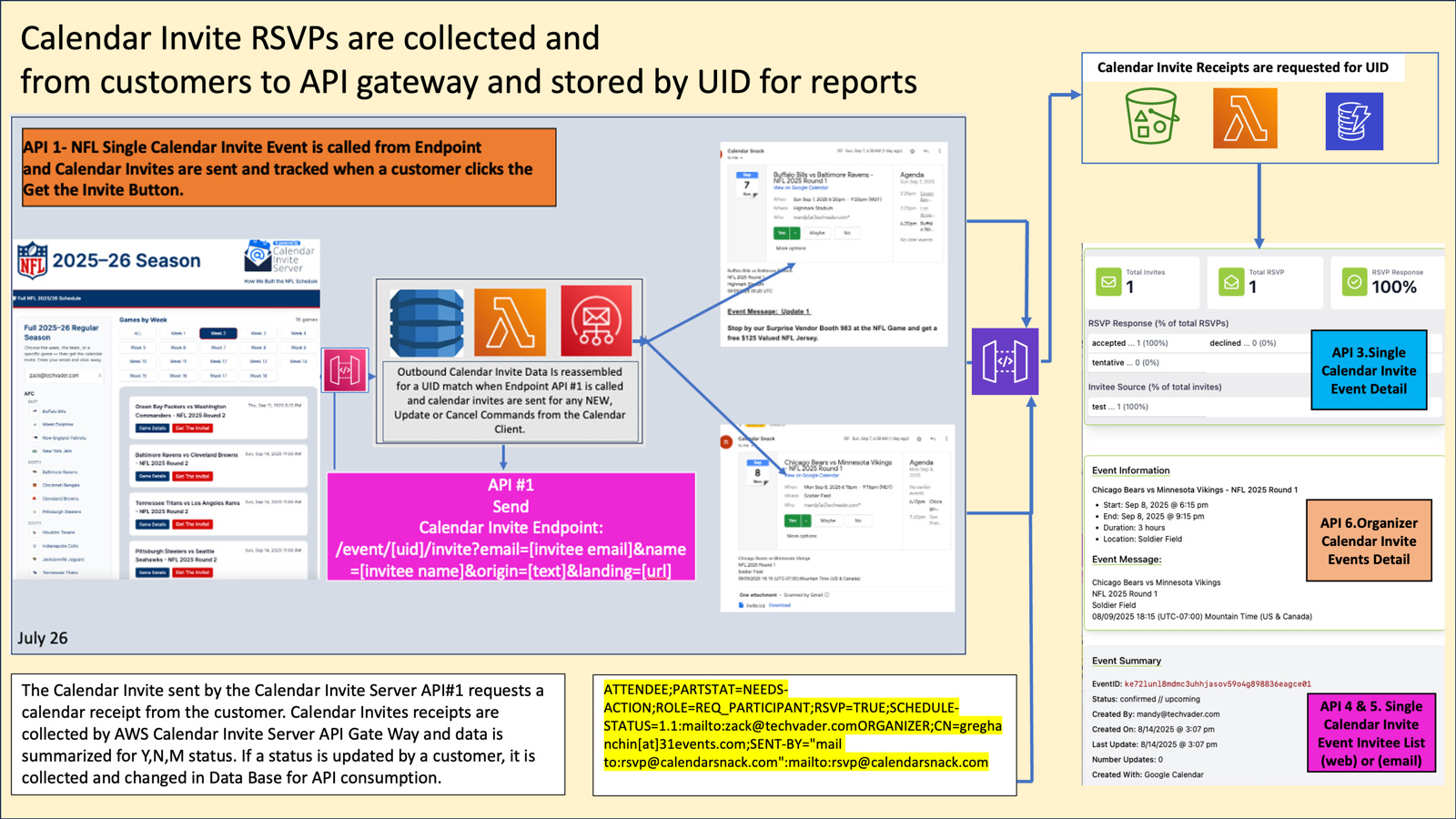 3- Calendar Reciept RSVP information is gathered of Y, N, or M and sent back to the API for reporting.