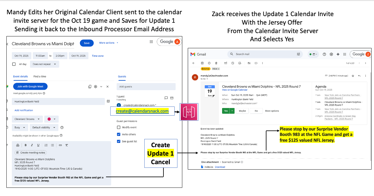 Mandy Edits the Orginal Calendar Event in her calendar client for that game and Saves the Event. That sends the Update to the Inbound Processor email address for a and build a new Calendar Invitations that includes the promotional Jersey and a Booth Number in the message body to those responded with a Y or M from the first calendar invite. This process is automated by the Calendar Invite server logic.