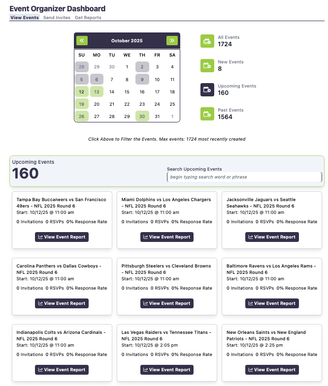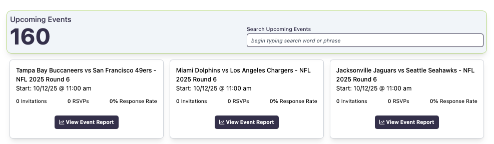 It displays the Event Title, Start Date, Start Time, Invitation Total, RSVP Total, and Response Rate in individual event cards at this level for easy viewing. The Event Cards have a button that will drill into View Event Report.