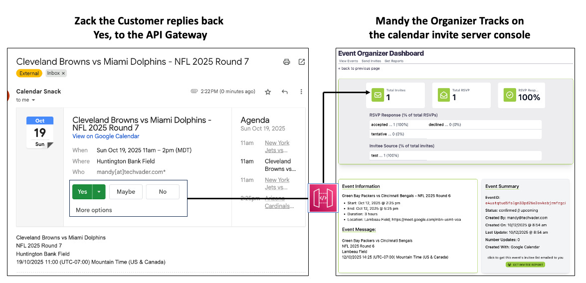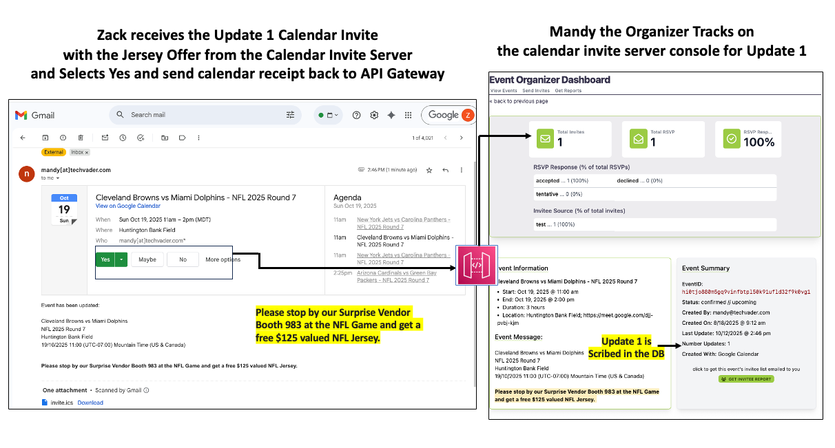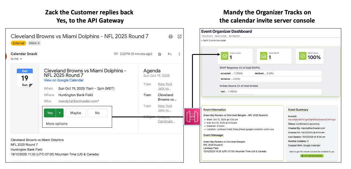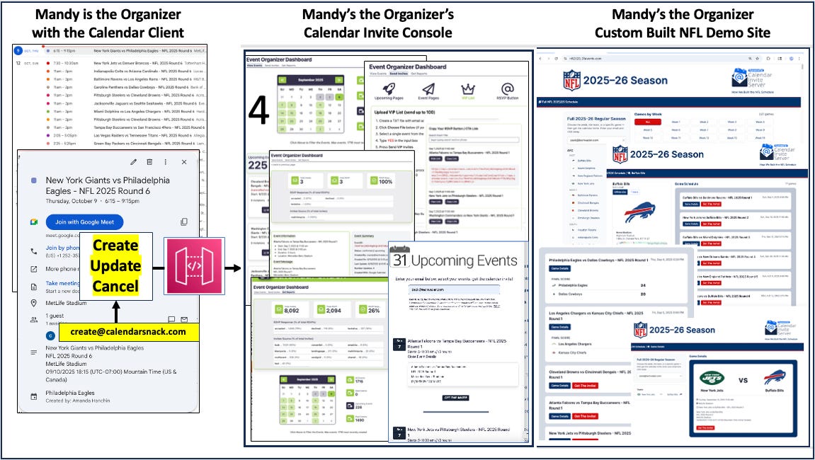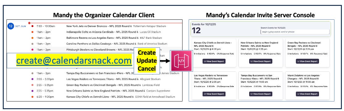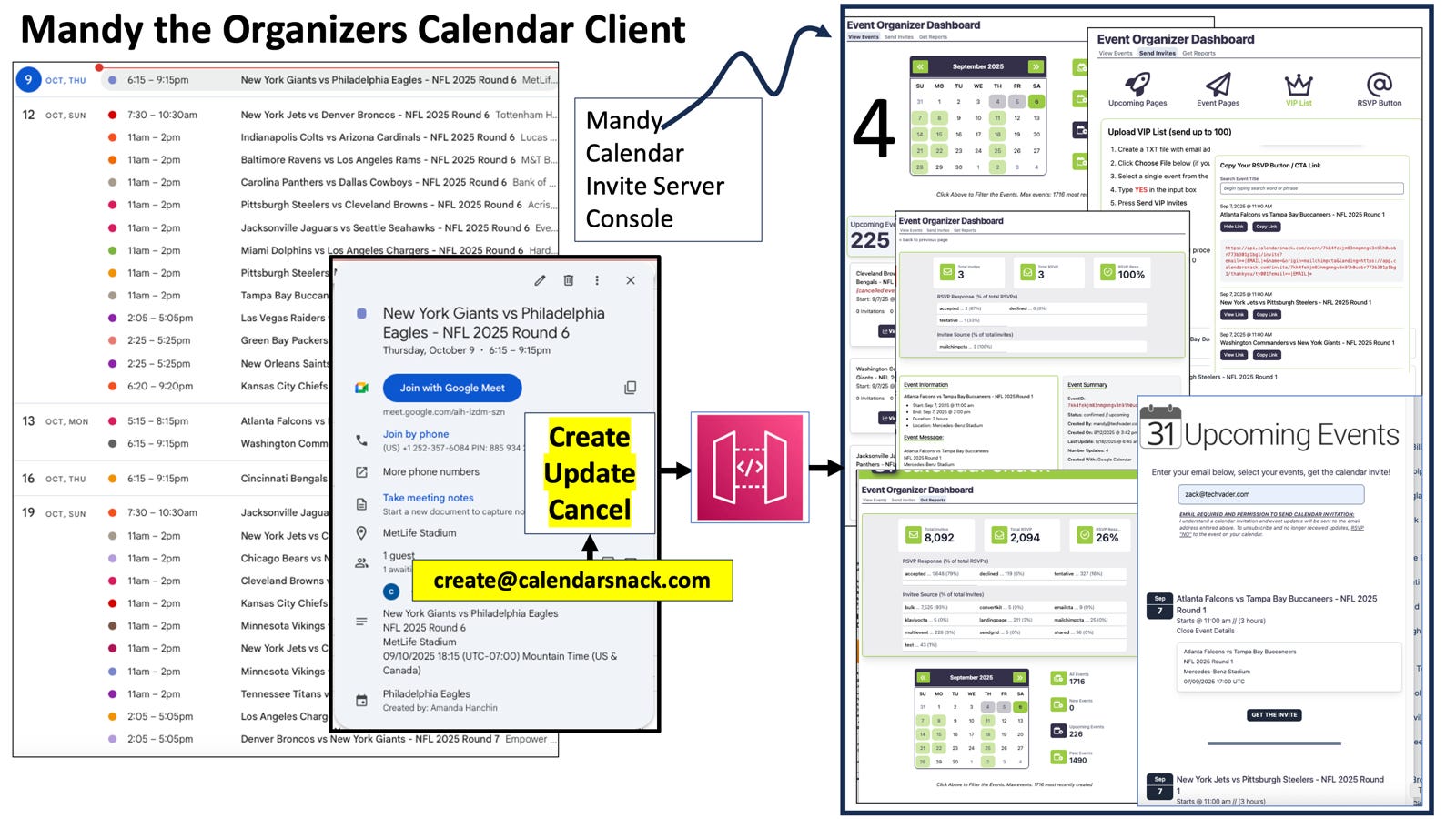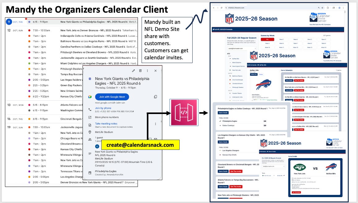 In this Diagram, the Calendar Event data on Mandy’s Google Calendar was sent to the Calendar Invite Server, processed, and stored for use in both the Calendar Invite Console and the NFL demo Schedule site.