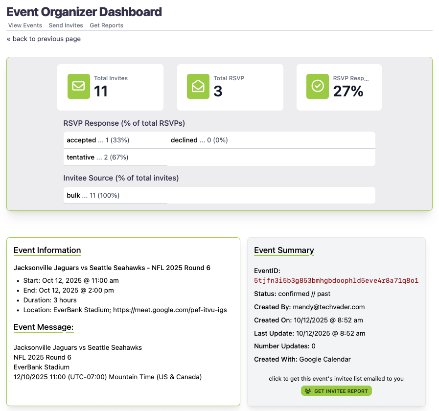 Event Summary contains EVENT ID, Status, created by, Created on Date and Time, Last Update on Date and Time, Number of Updates to the Calendar Invite Event, Created With: what Calendar Client. It also contains a button to click to get the detailed Event Invitee email List to be emailed to the Organizer’s email address in a CSV format.