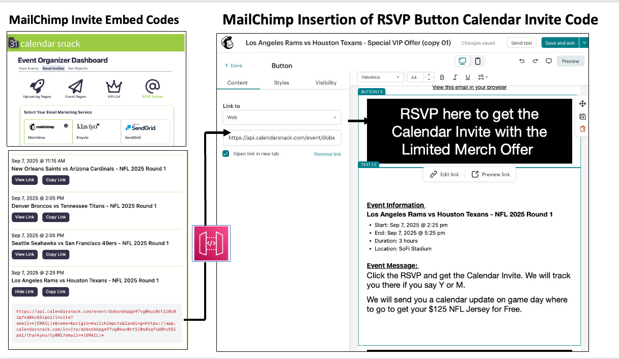 Mandy adds the new email address gathered from the NFL Promotion Site to her MailChimp email marketing list to promote a possible calendar invite embedded in the MailChimp Campaign.