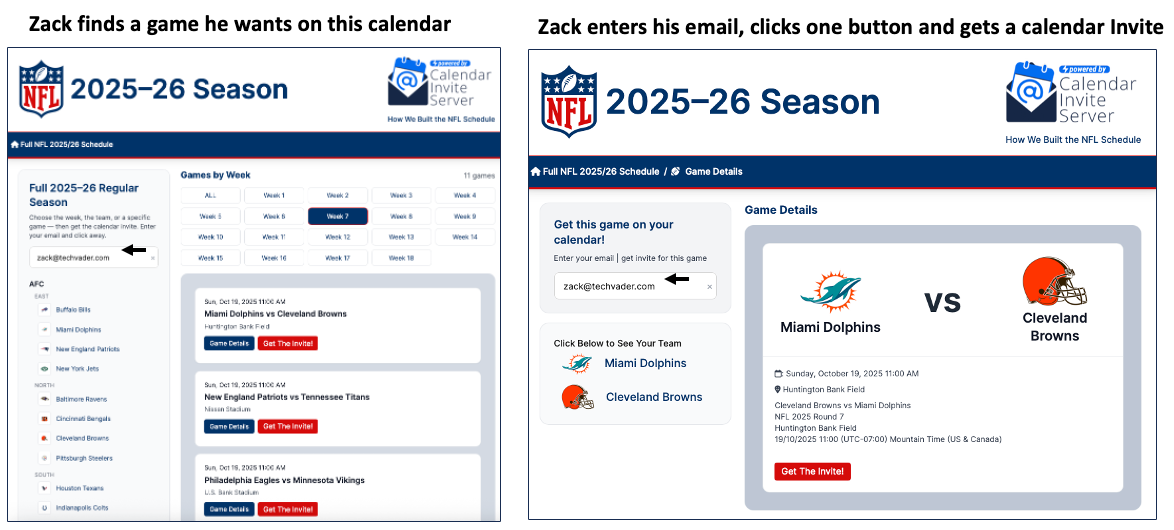 Customers like Zack in this Demo scenario visit the Game Schedule website, select some games, enter their email address, and receive a calendar invite.