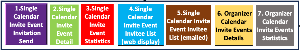 It summarizes the information for All Events, New Events, Upcoming Events, and Past Events, categorized by the Organizer's Email Address in the Calendar Client. This allows the API to drill into an S3 Bucket, accessing specific calendar days to call and view event data back to the display pages.