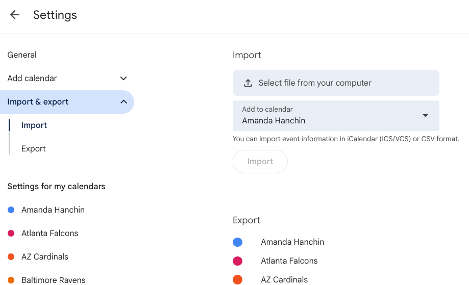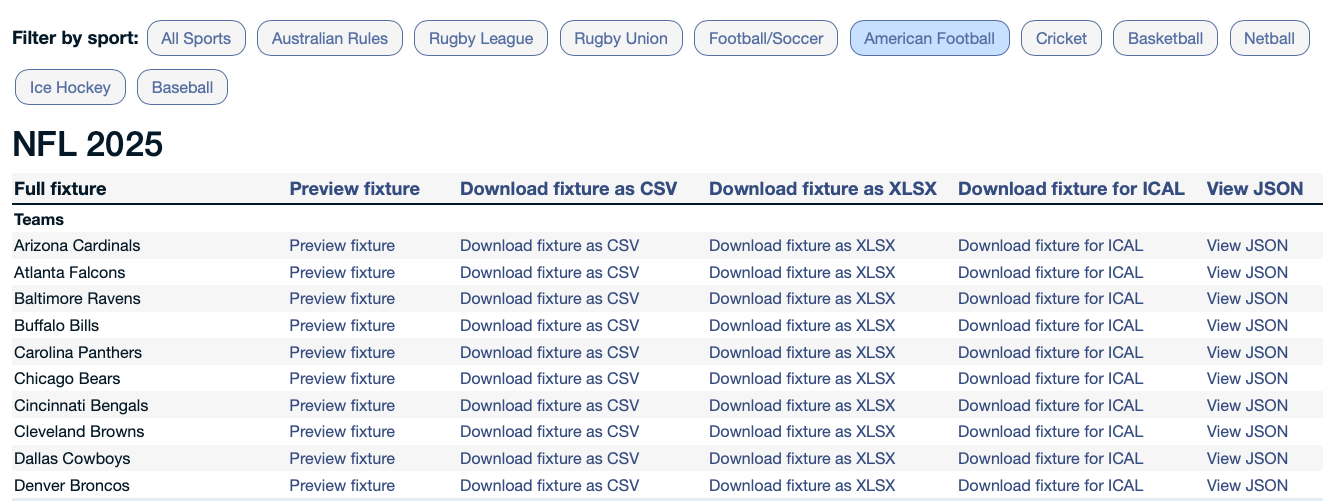 Mandy, the Organizer, uses her Google business account. She downloads the team's ICAL schedules from https://fixturedownload.com/sport/american-football and uploads them to her Google Calendar business account.
