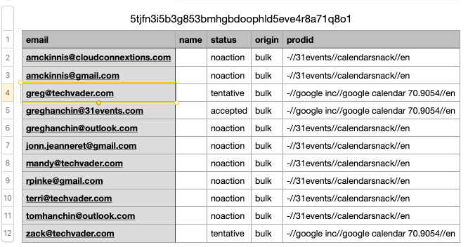 Mandy the Organizer will see several pieces of data gathered from the individual Calendar Invite for the Event, as well as Calendar Invite Receipt data collected from the customers who respond to the Organizer for their current status in their Calendar Clients. This is the interaction of Y, N, and M in the customer’s Calendar Client.