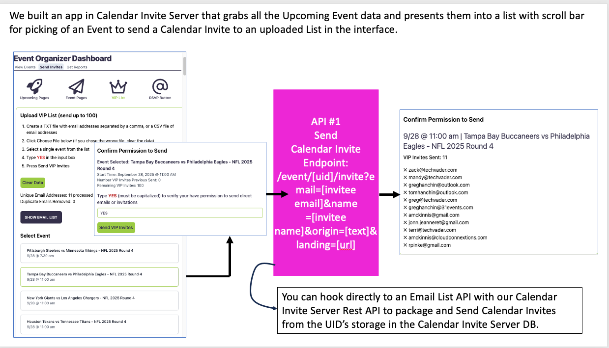 Example 3 - Or using an direct email list API from a third party vendor to send 1000’s of calendar invites using the same Calendar Invite Server Rest API. The Game Selector Picker could match the event to be sent and send it to Que for order for confirmation to the Organizer for Final review in the Calendar Invite Server Dashboard for final release of the batch send.