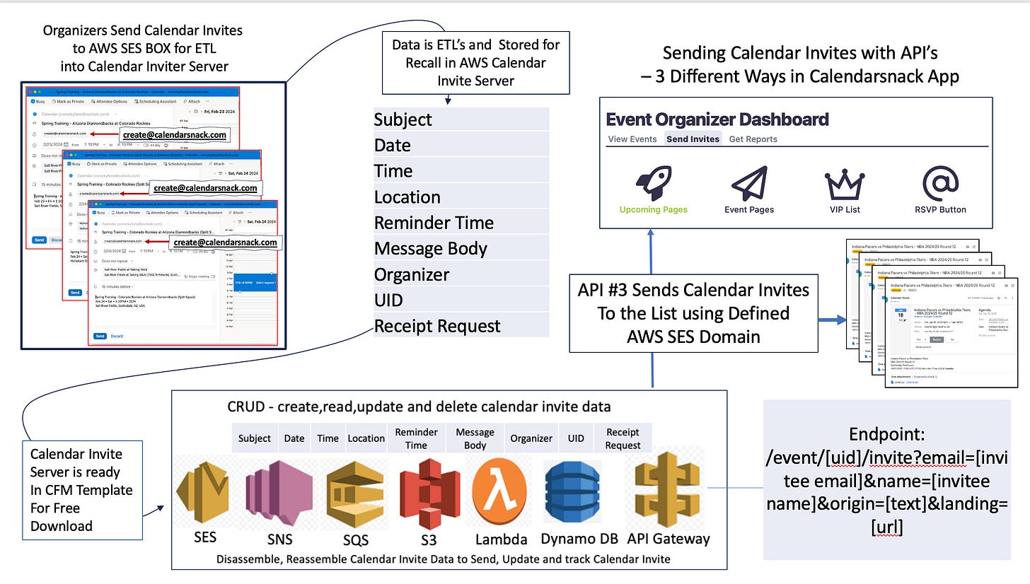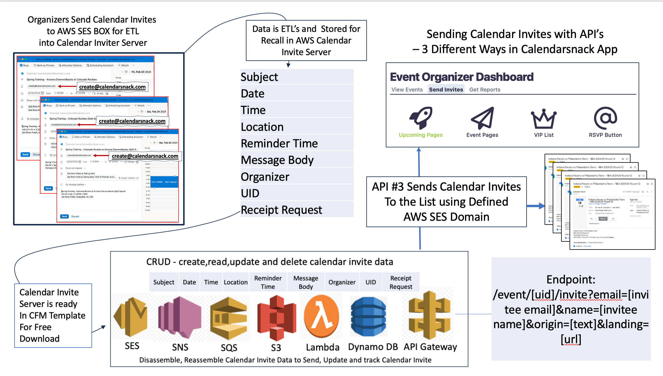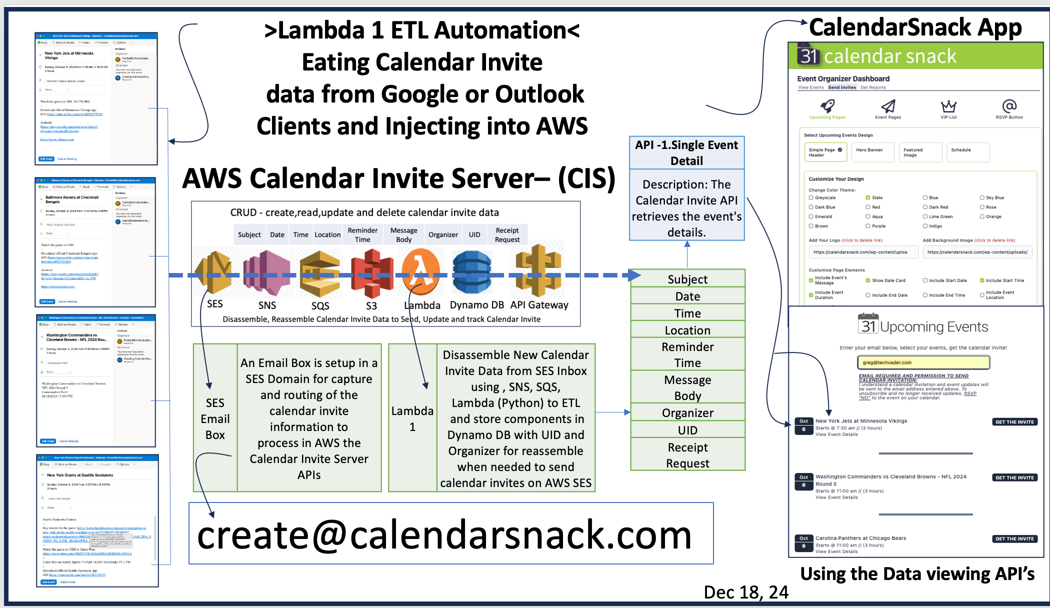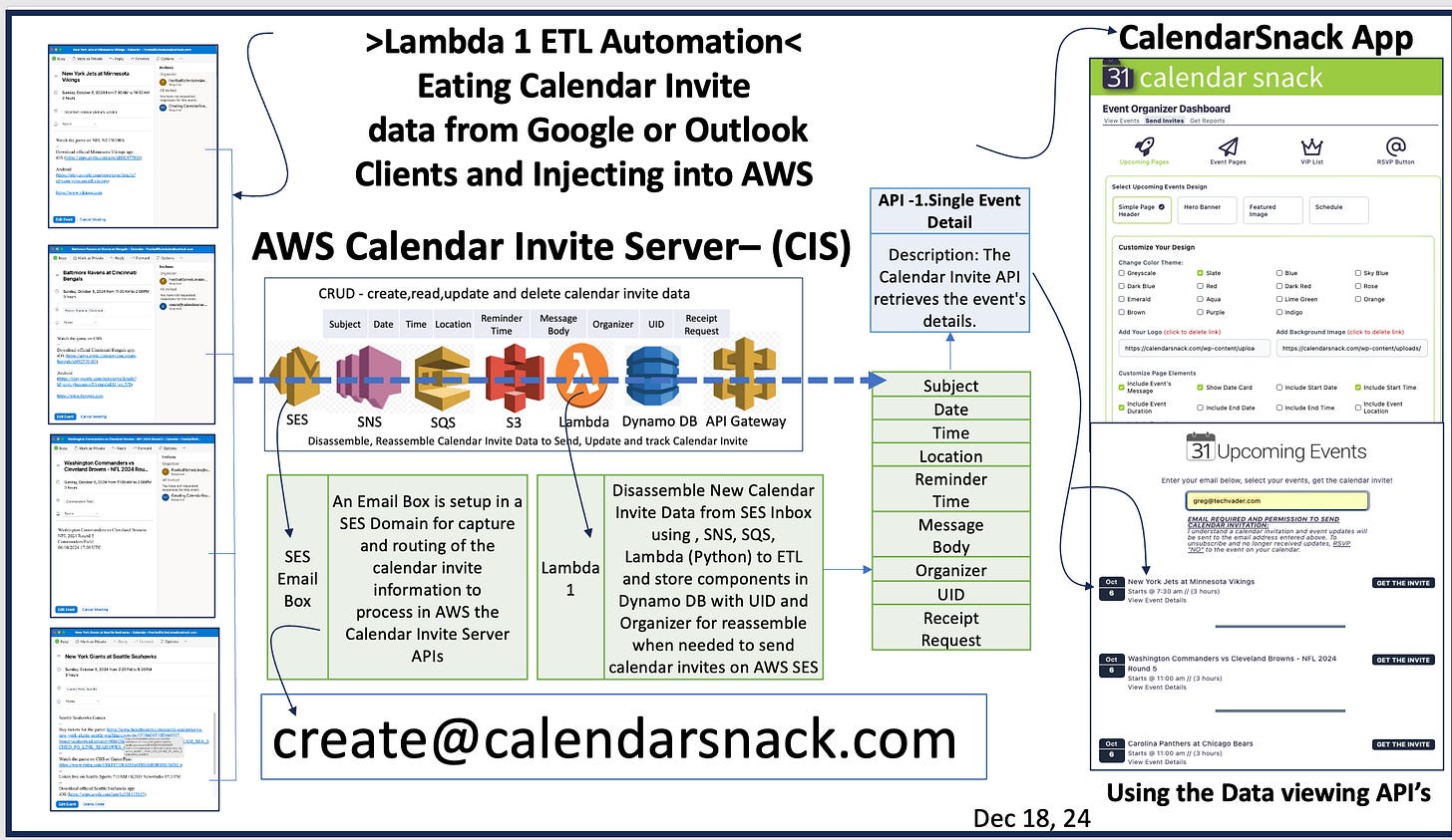 The calendar invite data is copied and stored in S3 when sent to the configured AWS SES email box. The calendar invite data from the multipart message is broken down into components using a series of Lambdas.