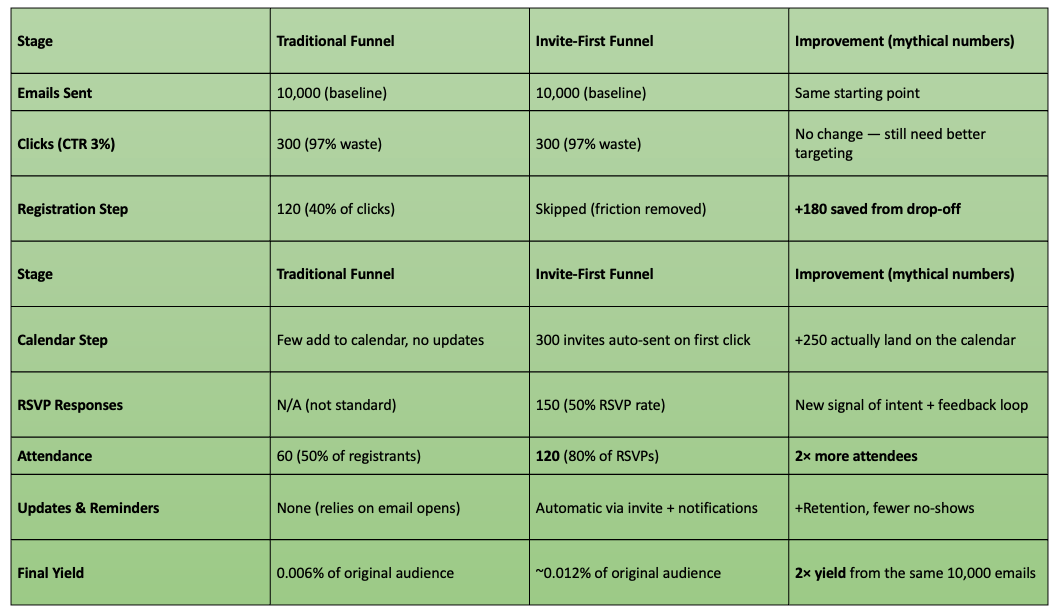 Traditional funnels primarily measure drop-off rates, highlighting inefficiency (e.g., a 99.94% waste rate). In stark contrast, the "Invite-First" funnel measures commitment. The high RSVP and acceptance rates prove that by removing friction and respecting the initial engagement, the model achieves a quality of commitment and engagement that traditional metrics cannot capture.