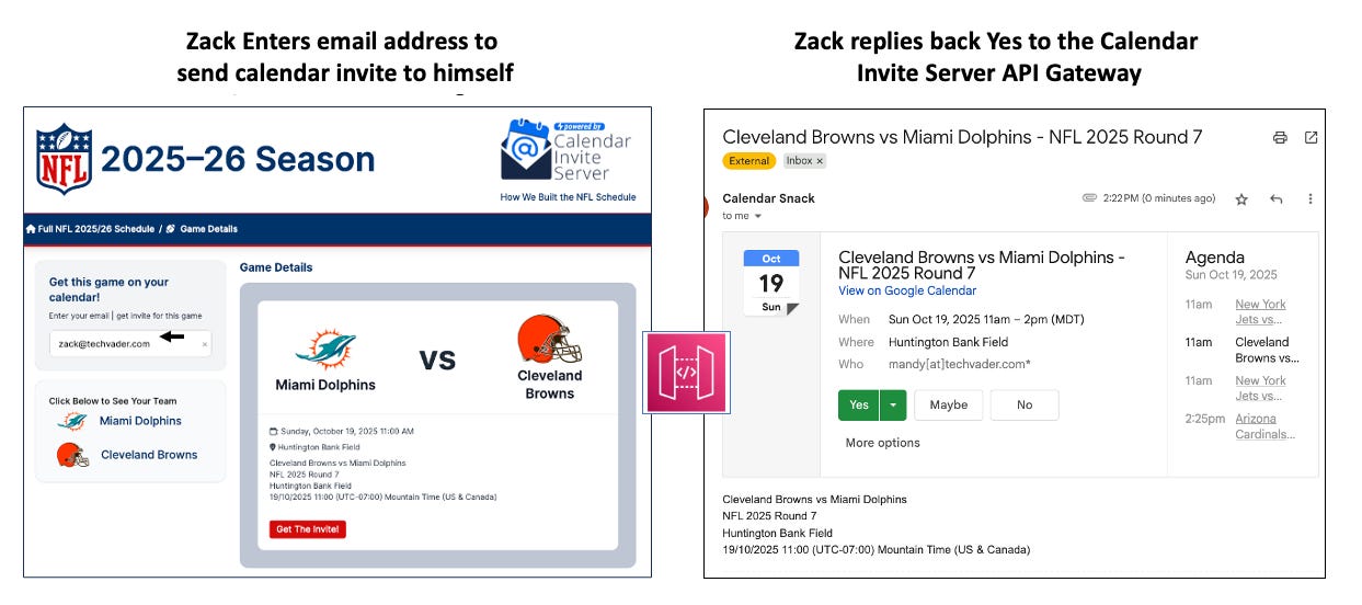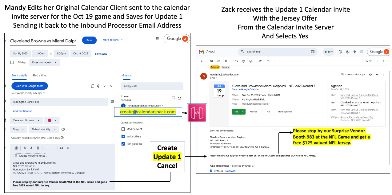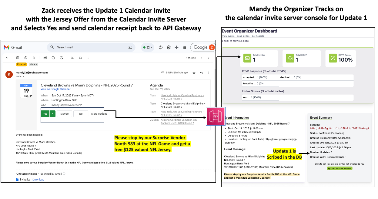 With a calendar invite server, the connection remains live. For example, a week before a big game, Mandy can edit the original event in her Google Calendar to add a promotion, like “Show this invite at the booth to get 20% off your team jersey!” When she saves that change, the update is automatically sent to every customer, like Zack the Sports Fanatic, who has already responded with a “Y or M status” (Yes or Maybe). Behind the scenes, the server intelligently tracks each version of the event, ensuring that every attendee receives the correct update without creating duplicate entries or confusion.