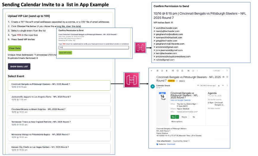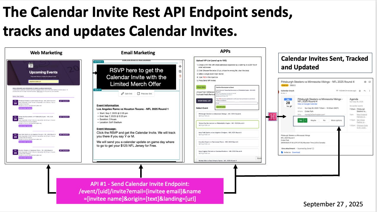 Direct Sending to Lists: The system’s REST API allows you to send calendar invites directly to curated email lists. This is perfect for sending exclusive event details to a VIP list, distributing webinar schedules to registrants, or enhancing newsletters on platforms like Sub Stack with actionable, calendar-based content.