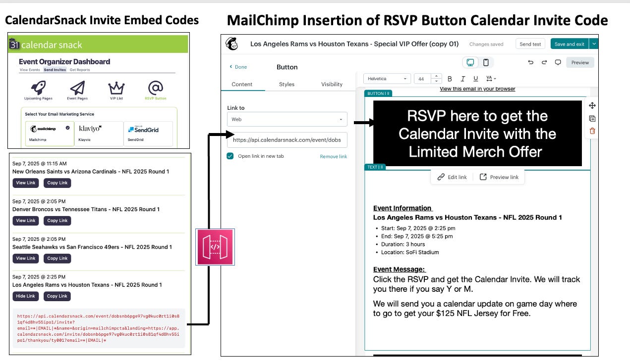 Email Marketing Integration: Instead of a static “Add to Calendar” button, you can embed calendar invite API code directly into the Call-to-Action buttons in your email marketing platforms like MailChimp, Klaviyo, and HubSpot. When a user clicks, they receive a live, updateable invite, and you gain a persistent communication channel.
