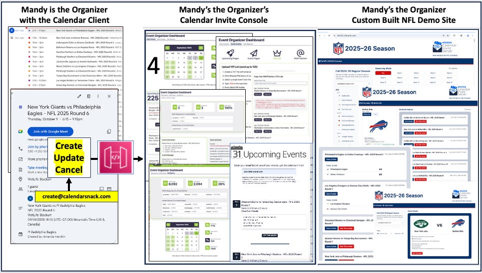 This simple email acts as the trigger—an “Inbound Processor”—telling the server to ingest, process, and prepare the events for distribution. From that point on, her Google Calendar is her command center. To push an update, add a promotion, or change a detail for a game, she opens the event in her calendar, makes the change, and clicks “Save.”