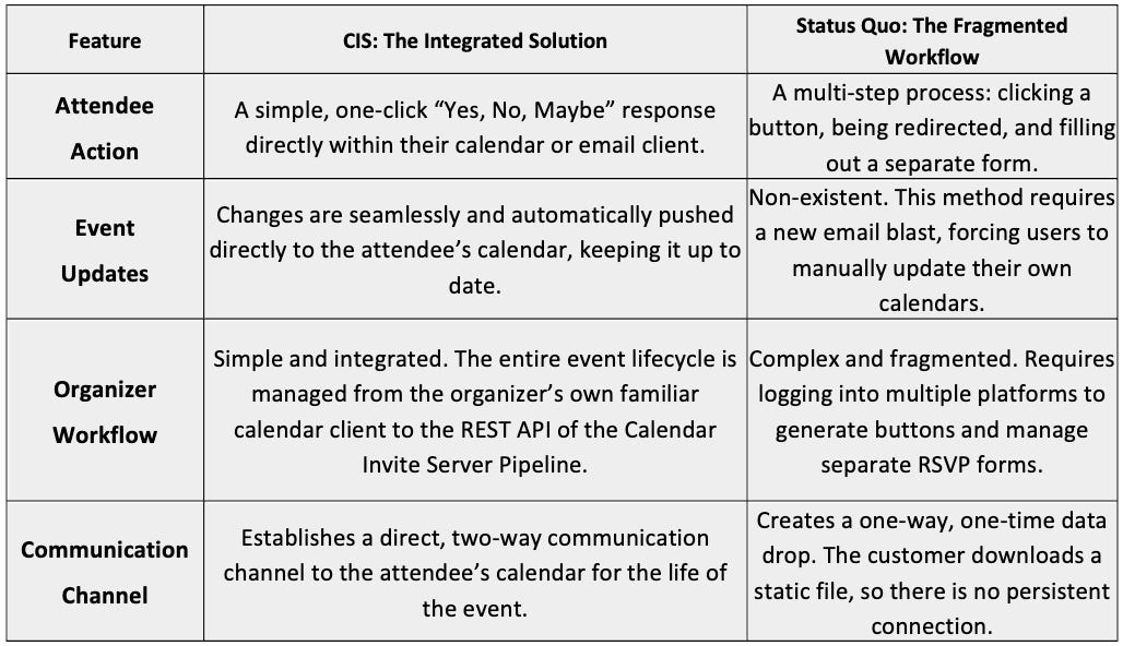 More critically, the ‘Add to Calendar’ method creates a severe data gap for event organizers. This one-way data drop provides no mechanism for collecting RSVP receipts (Yes, No, Maybe), as the reply data “goes nowhere.” This forces organizers to deploy separate, cumbersome RSVP forms, creating a disjointed user experience and preventing them from collecting valuable telemetry on user intent. This forces organizers into a fragmented and data-blind workflow, highlighting a clear and urgent market need for a unified solution that closes the loop between event notification and intent measurement.