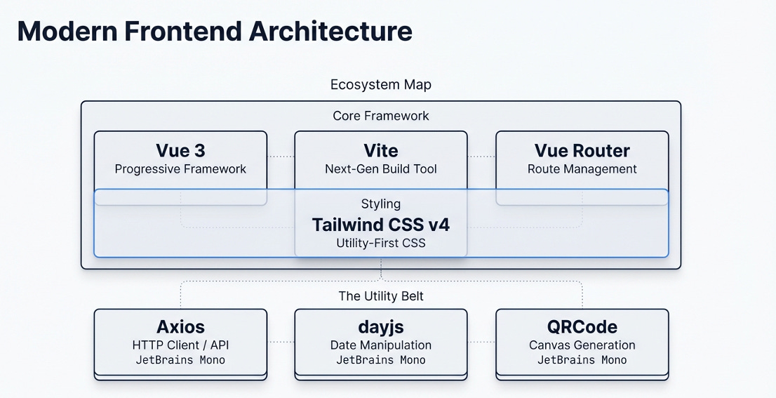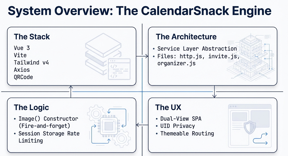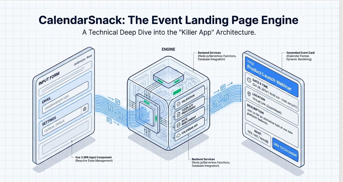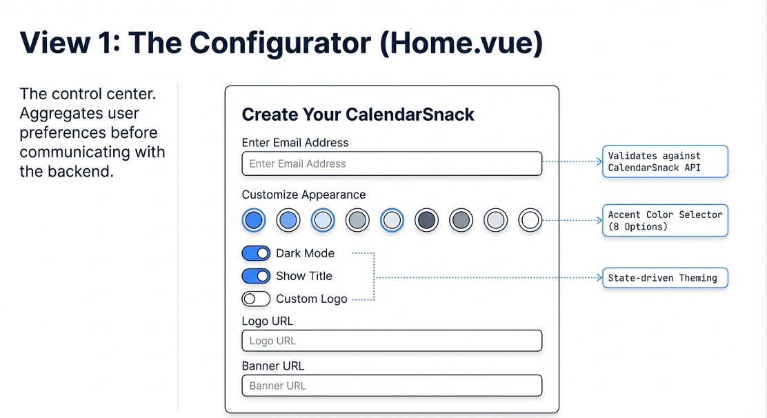 The Calendarsnack Front End uses Vue.js, JavaScript, Arrays, Tailwind CSS, and HTML, along with APIs from the CalendarInvite server to display data and use the calendar invite messaging pipeline.