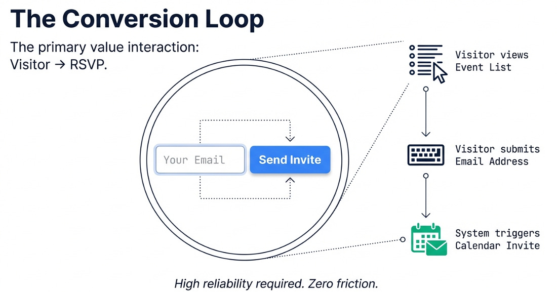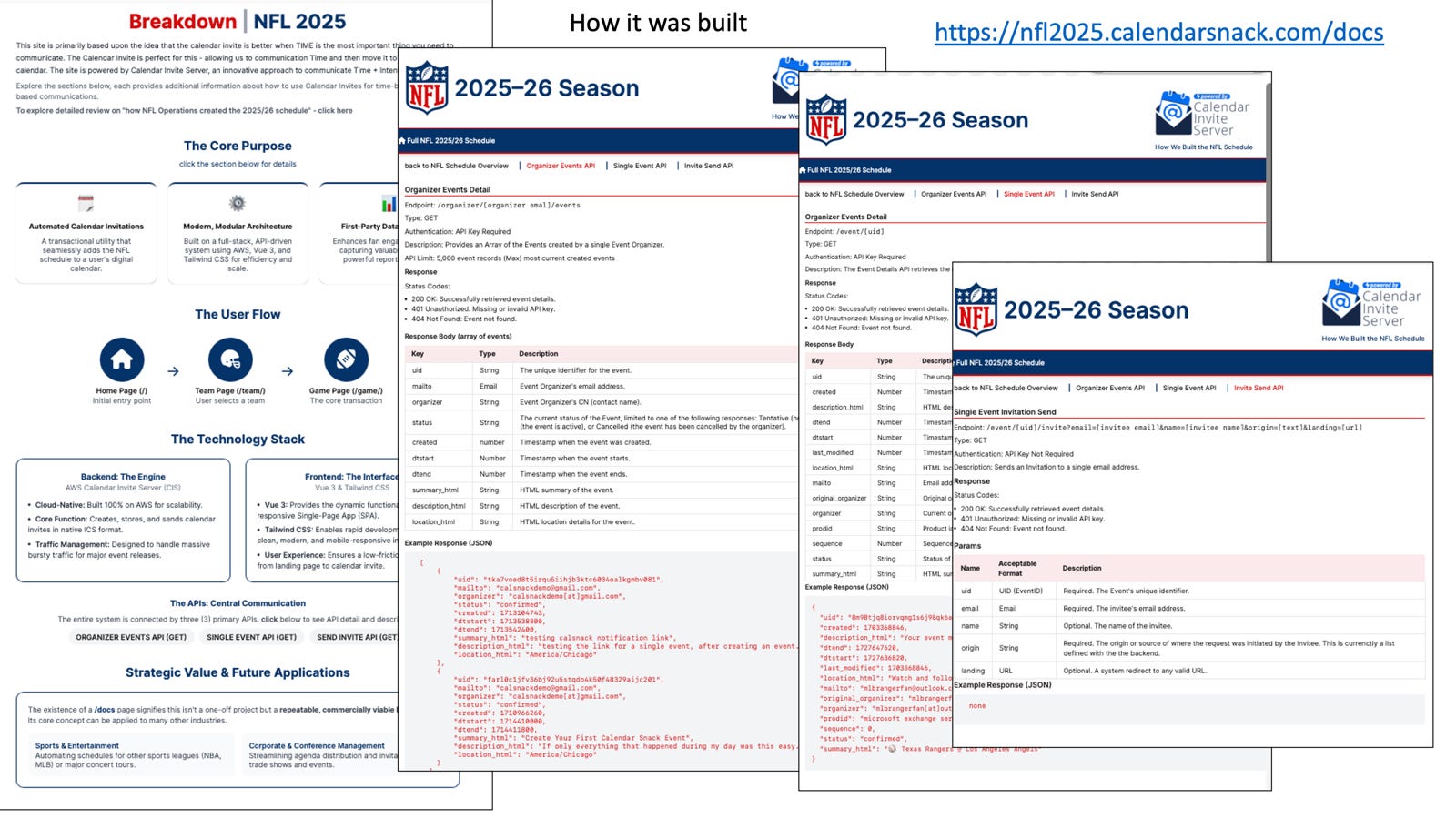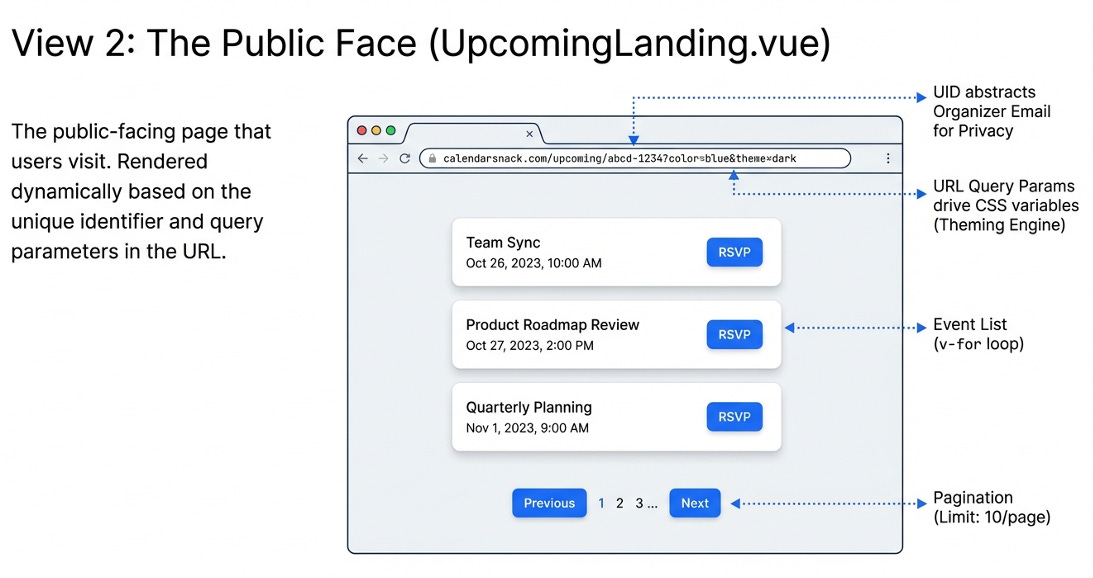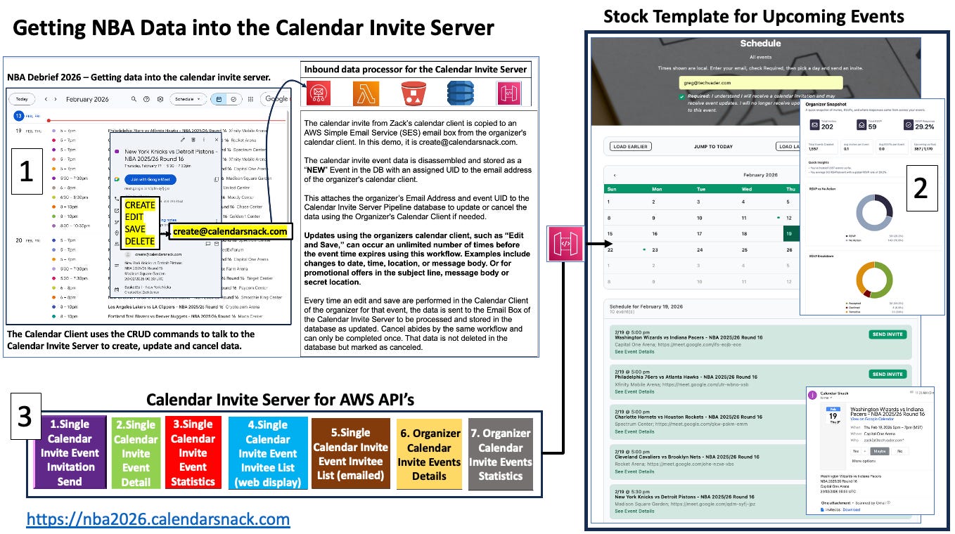 The Organizer displays APIs used to generate the page using the VUE.JS framework, and a REST API that recreates Calendar Invites on the fly and sends and collects calendar receipts via the CTA Button labeled “Send Invite,” which triggers the UID-to-Email workflow in the background.