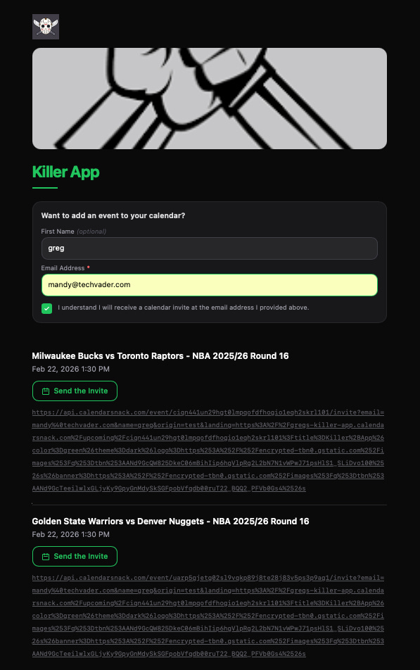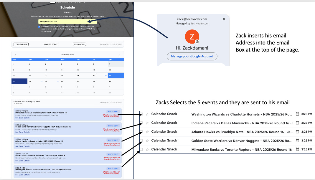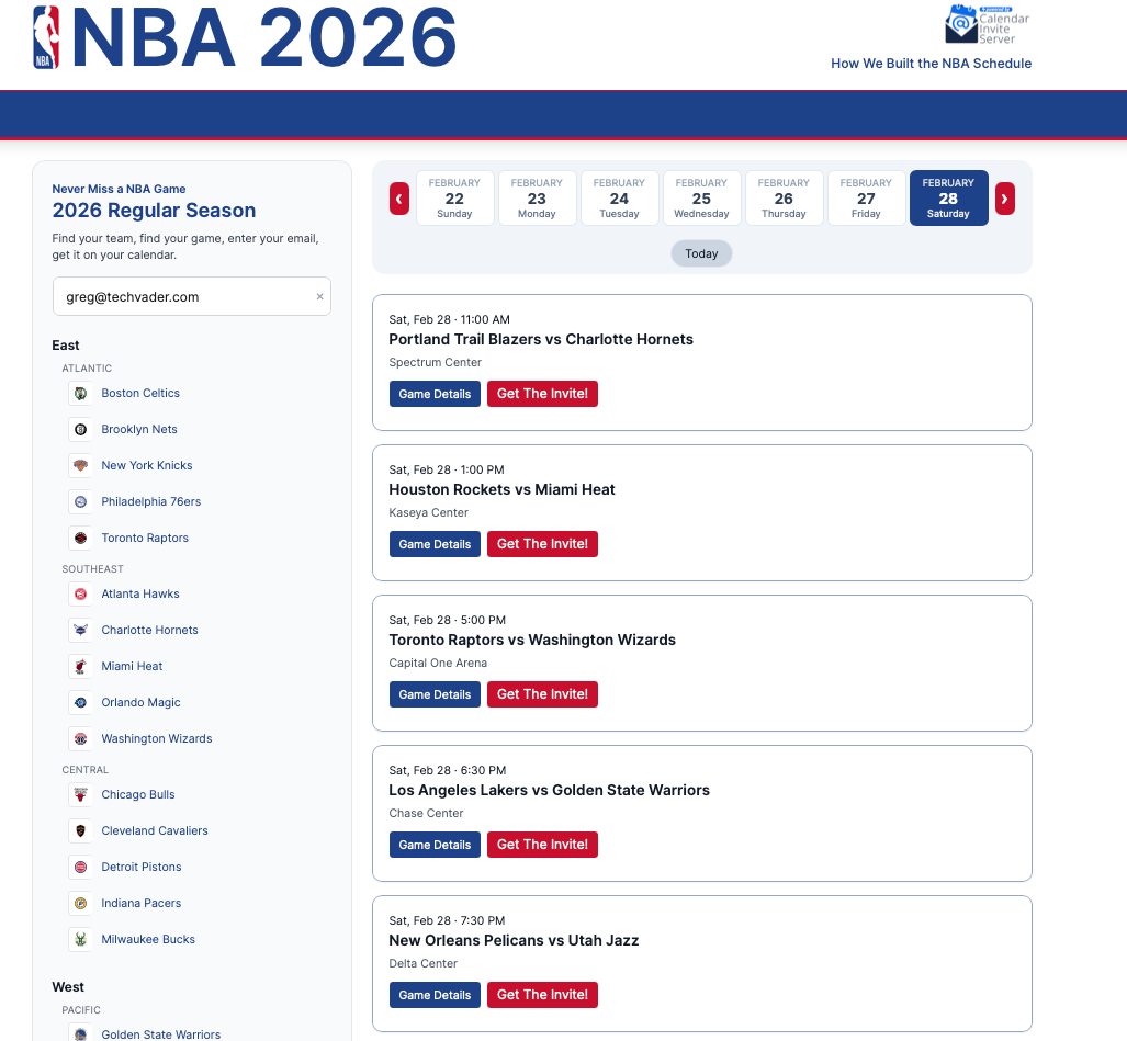 Customer enters an email address at the top, selects the games with one click, and sends a calendar invite that is tracked and can be updated by the organizer.