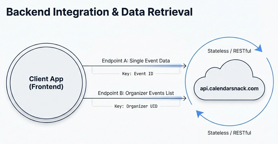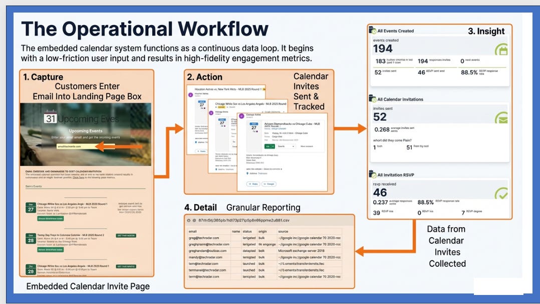The Front End displays calendar invite data on web pages and in email as CTA codes for 1-click calendar invite sending and tracking.