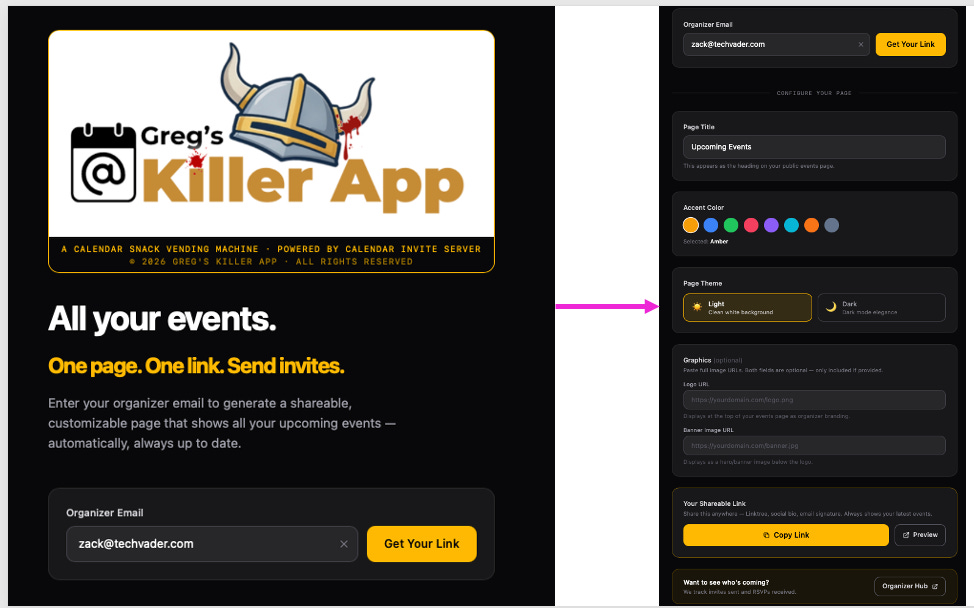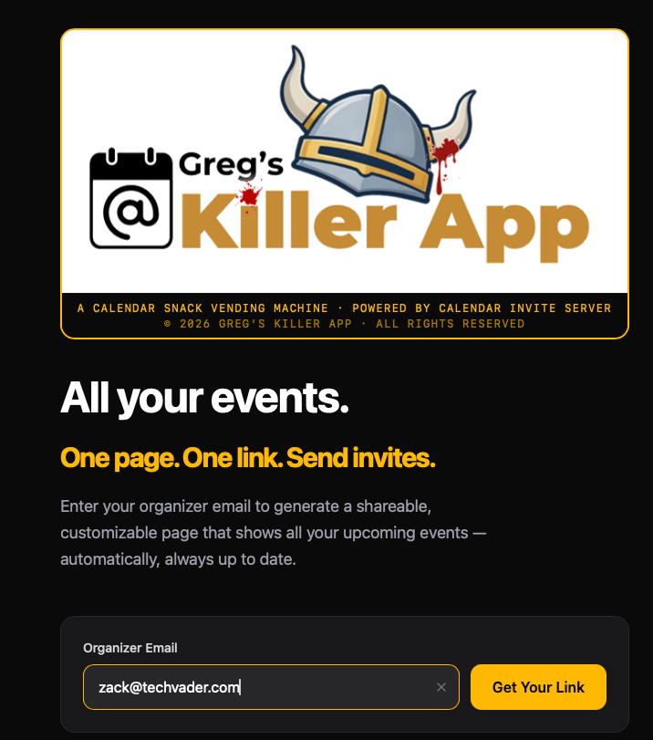 Once that step is complete and the Organizer has data in the account for display, they head to this page to enter the email used in their Calendar Client to generate the calendar invite server data.