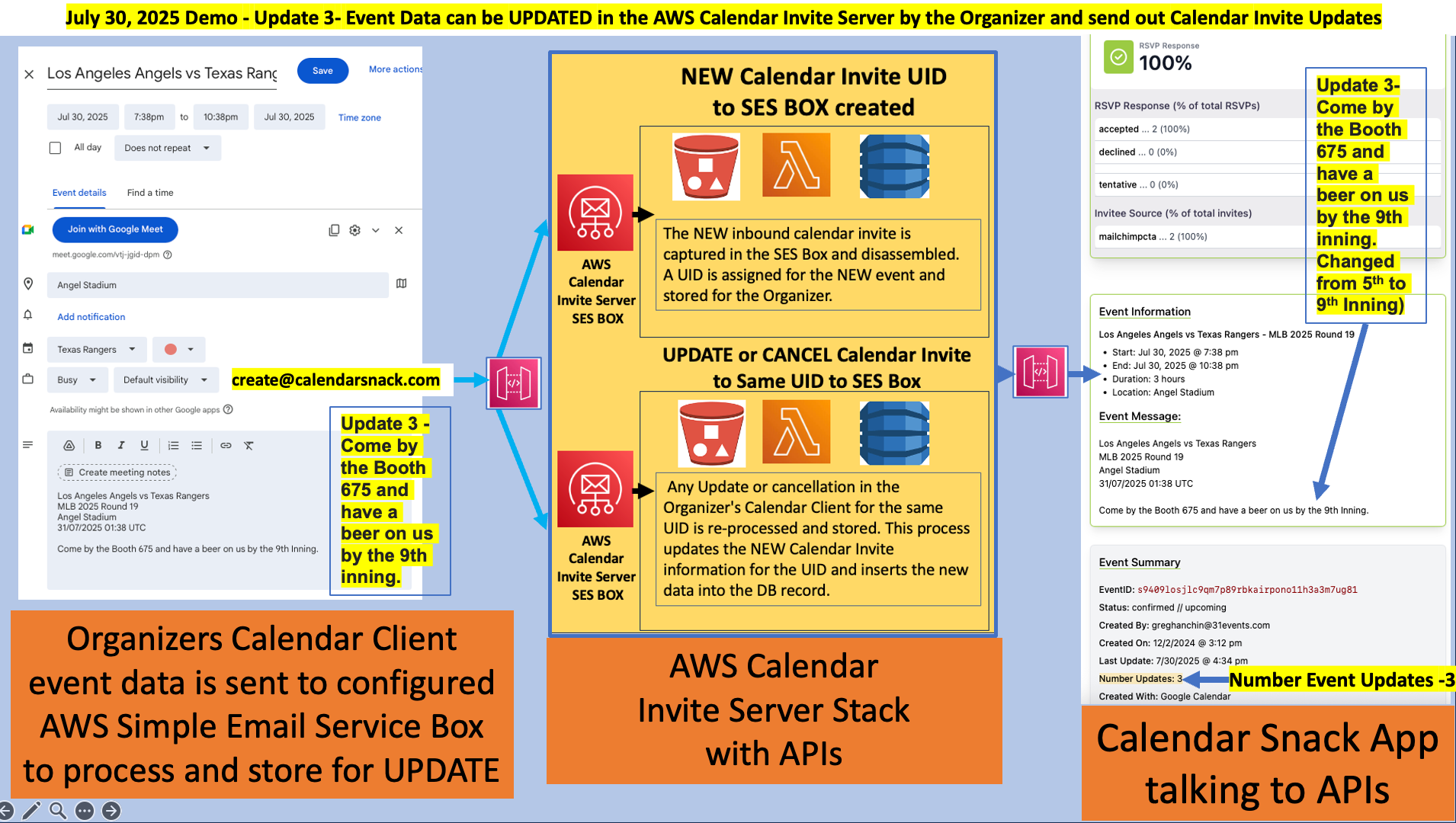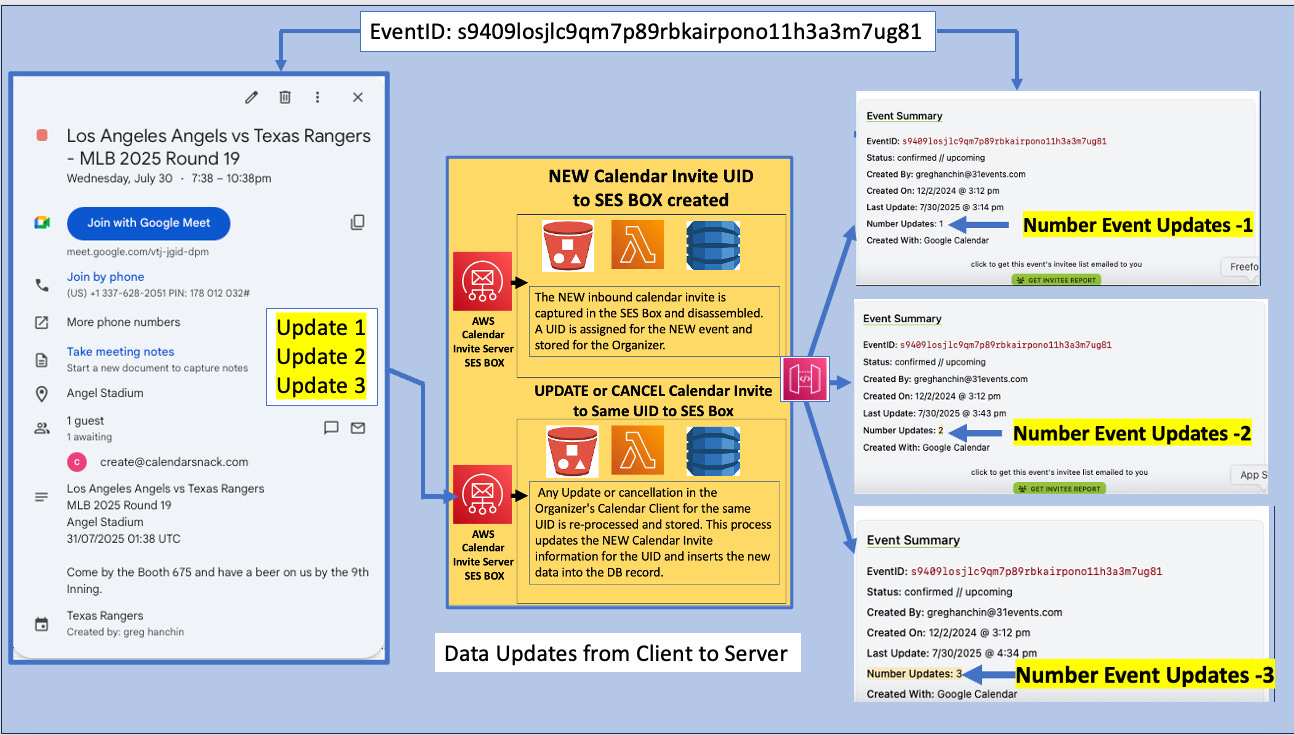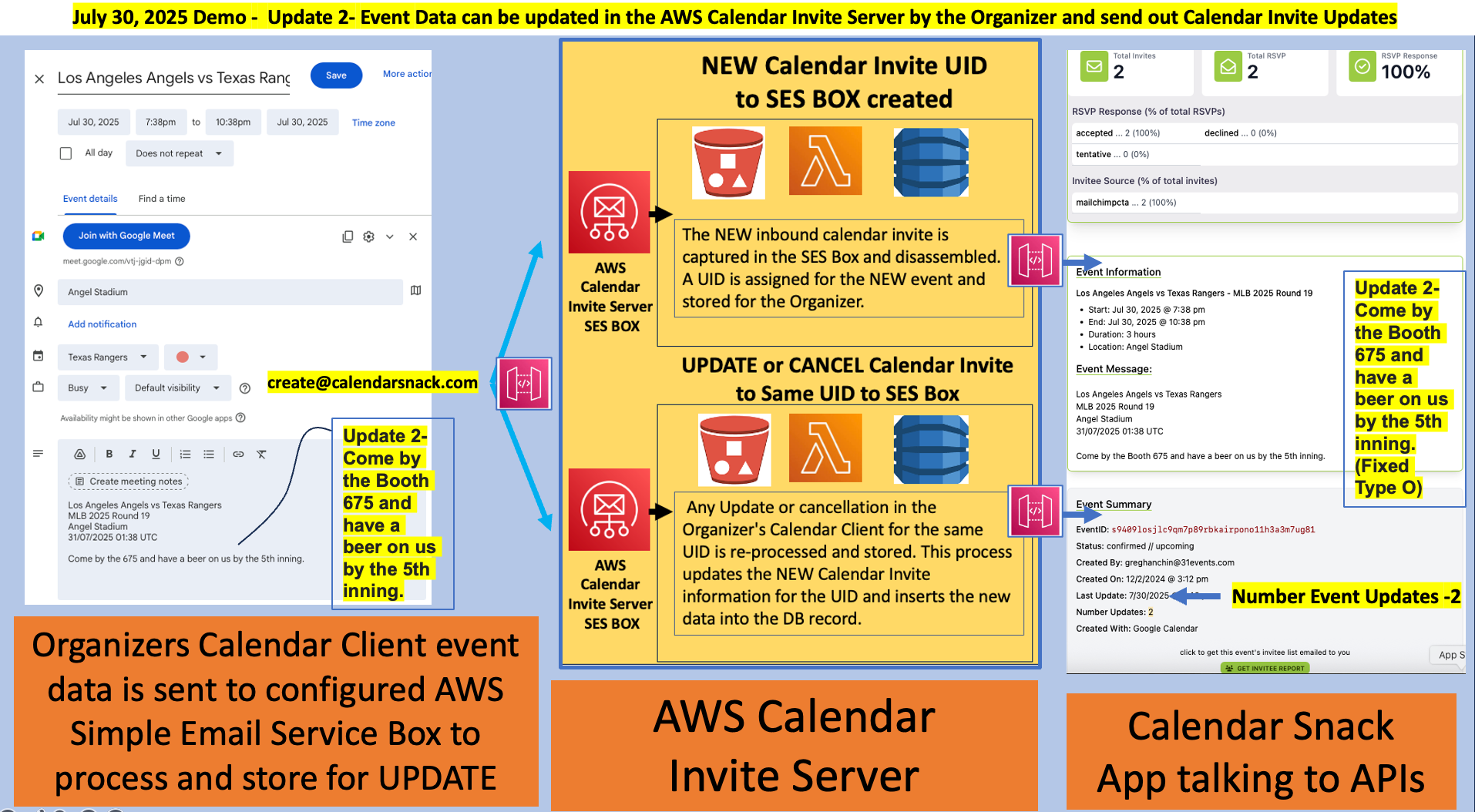 We also save the Calendar Client data for the Angels vs. Rangers game on July 30th pushing the new data to the AWS Calendar Invite Server to be processed.