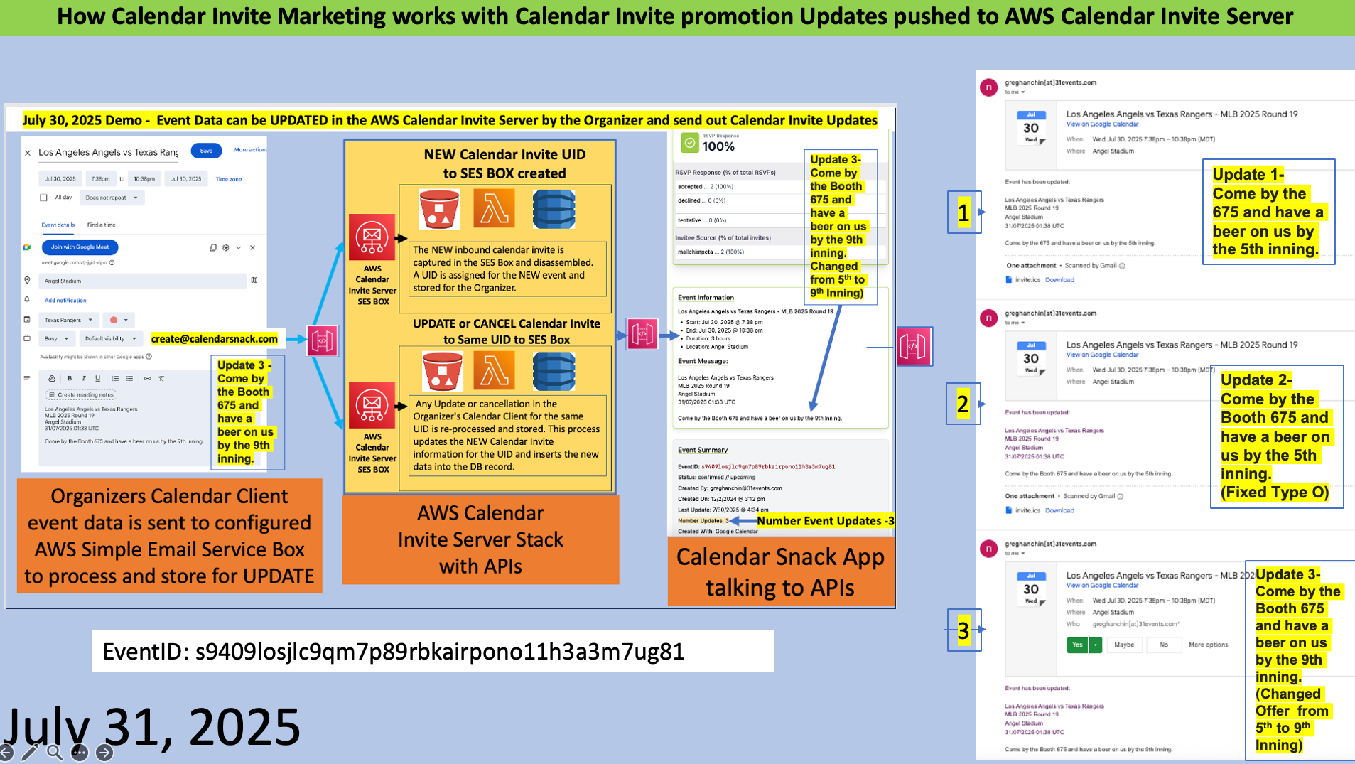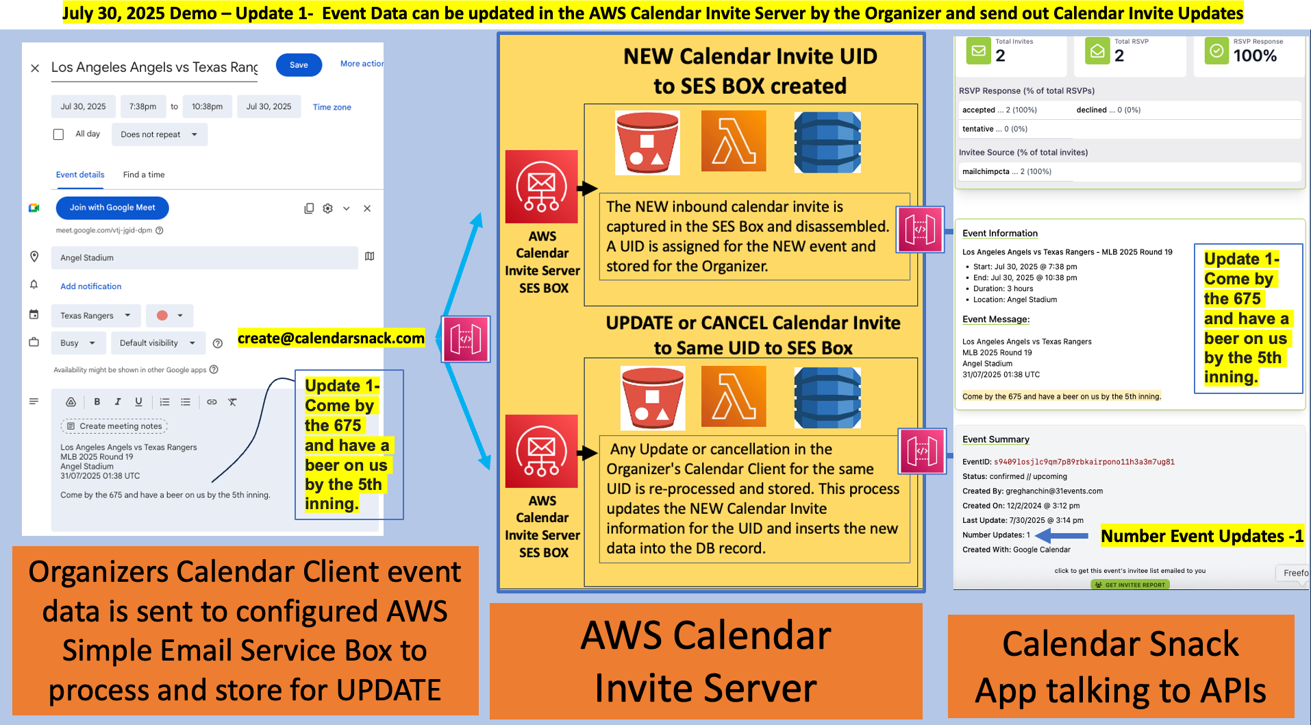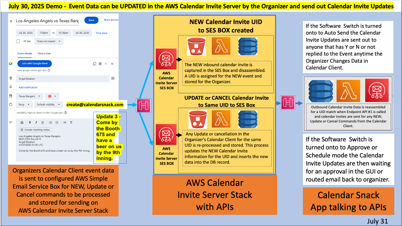 We also save the Calendar Client data for the Angels vs. Rangers game on July 30th pushing the new data to the AWS Calendar Invite Server to be processed.