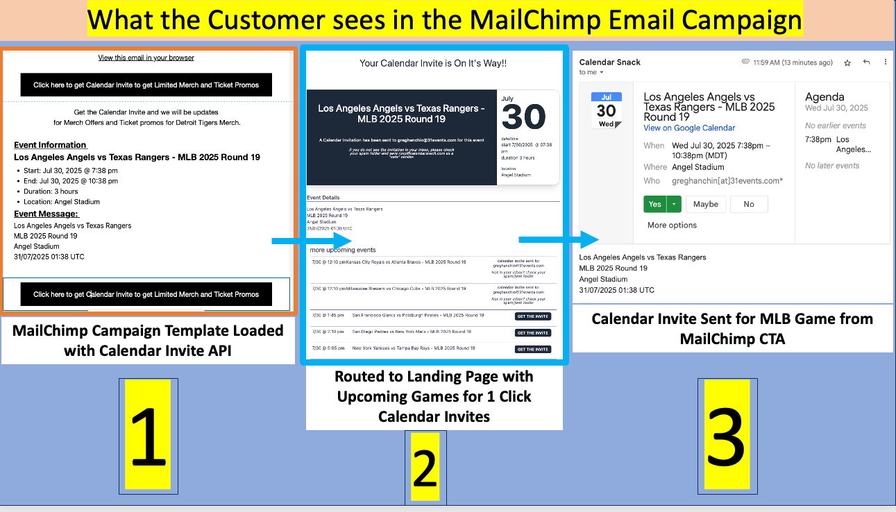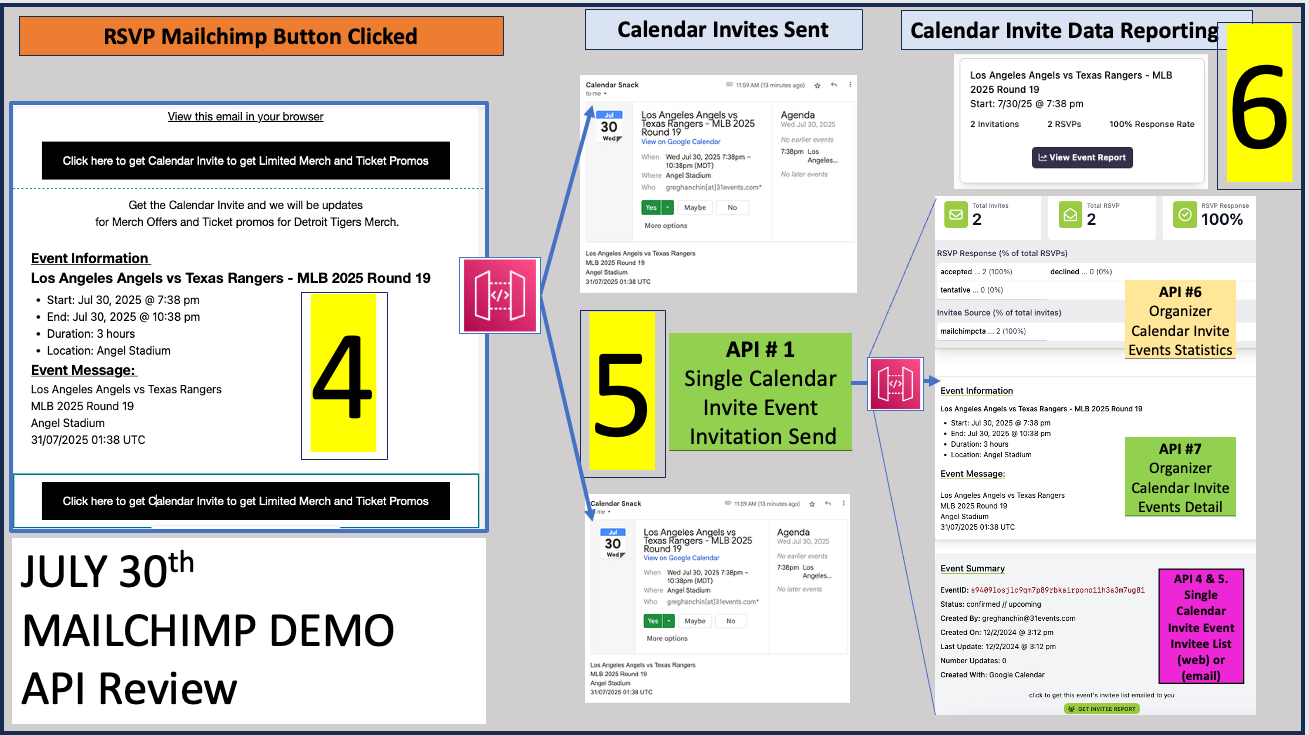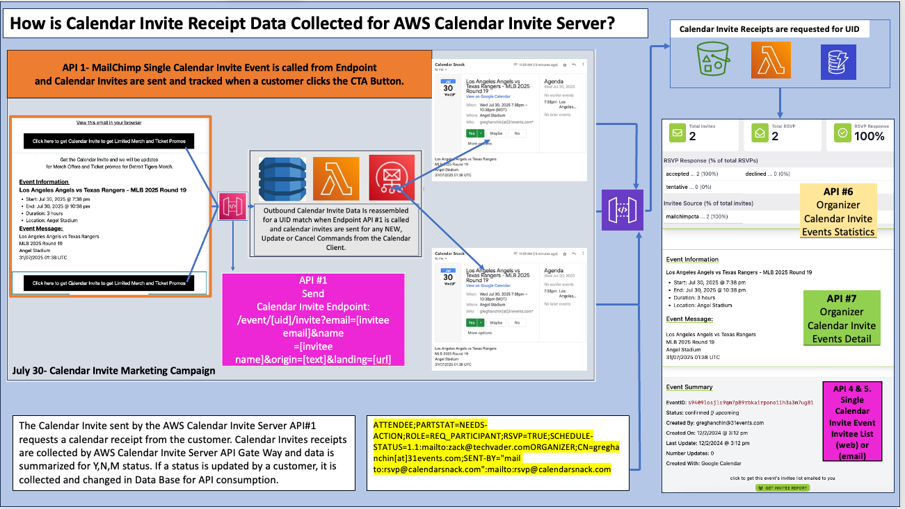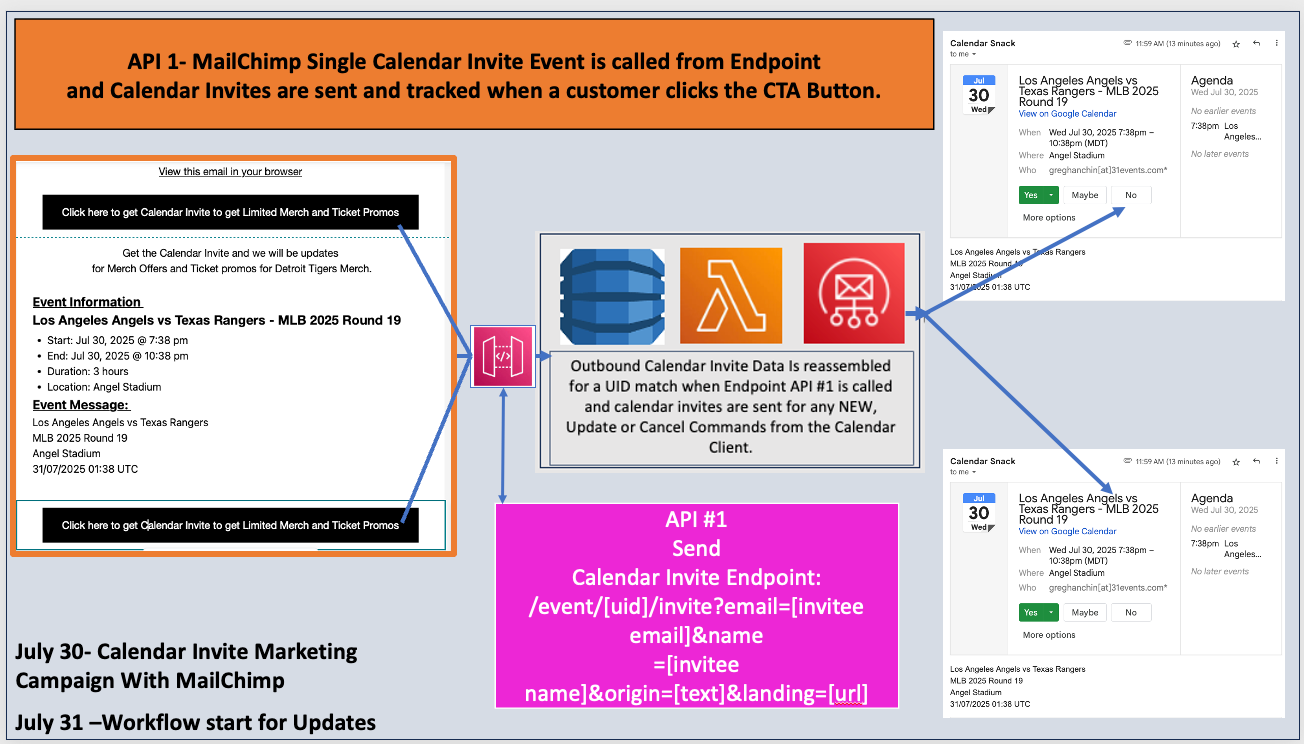 When the MailChimp User Clicks the RSVP button, the calendar invite is sent from the AWS Calendar Invite Server for the MLB Game, and calendar receipts are requested to track customer intentions.