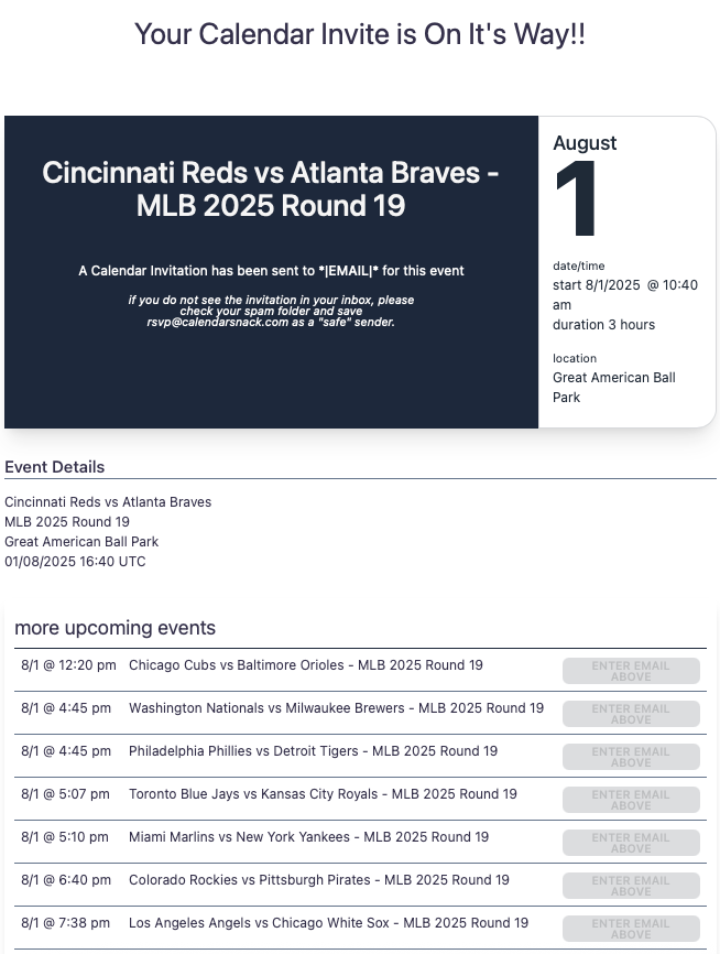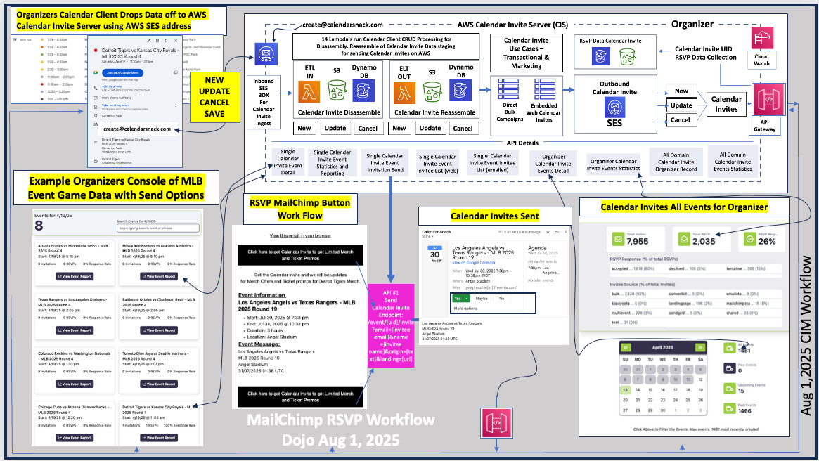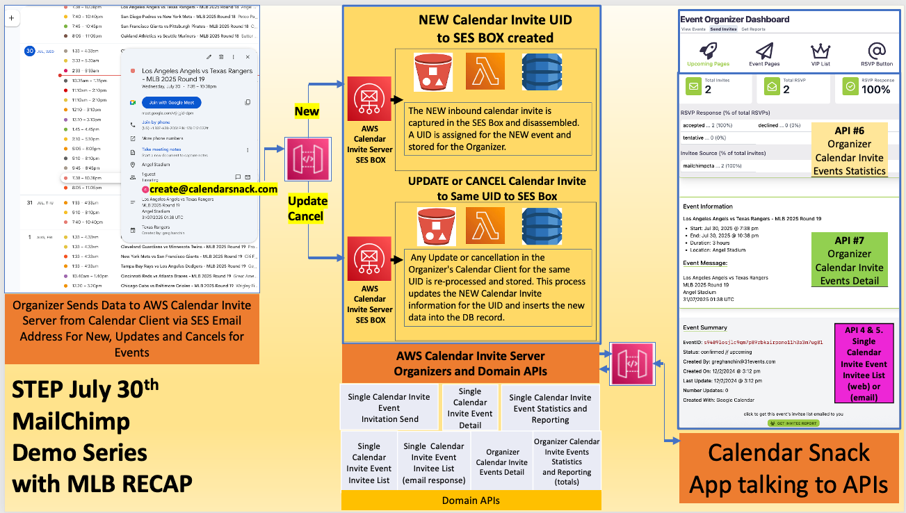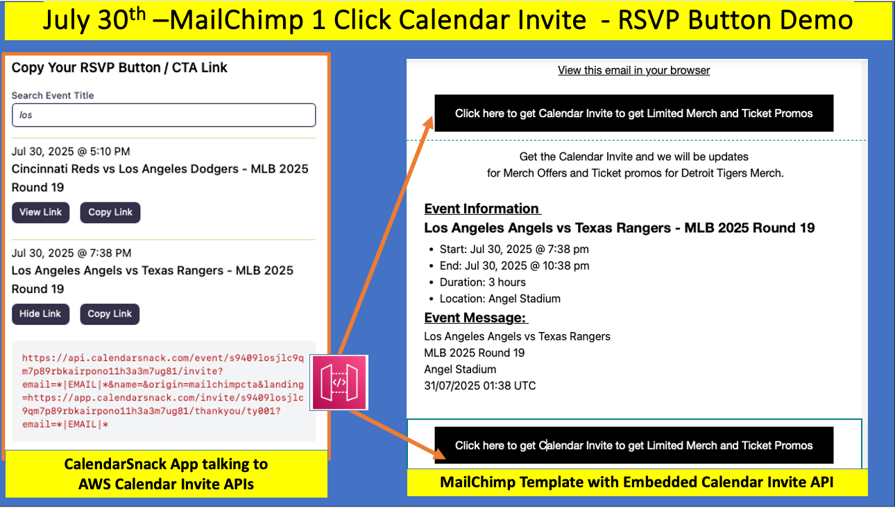When the MailChimp User Clicks the RSVP button, the calendar invite is sent from the AWS Calendar Invite Server for the MLB Game, and calendar receipts are requested to track customer intentions.
