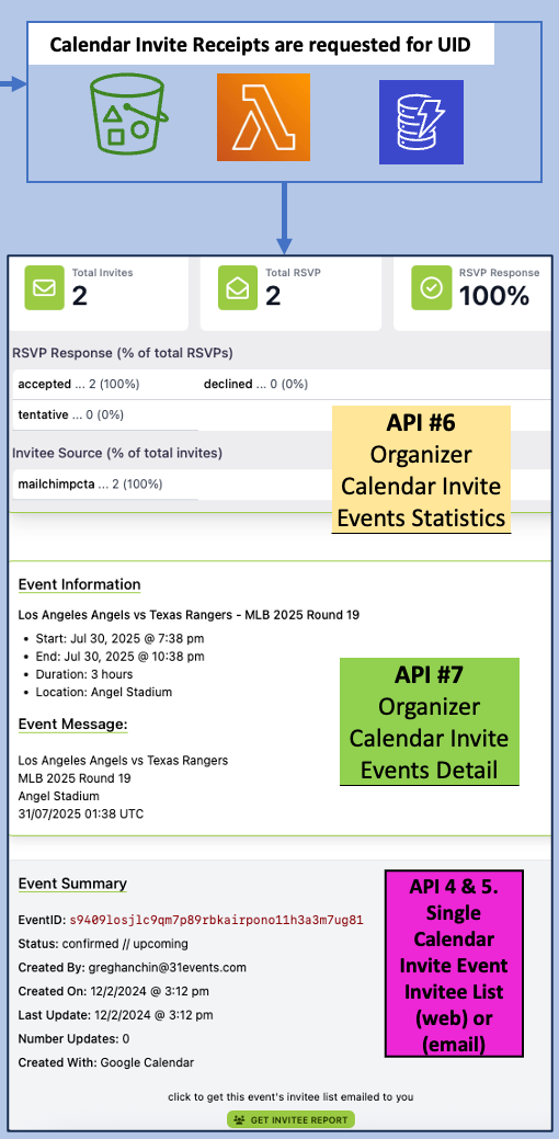 API #1 End Point matches the UID data pulled from the storage layer, assembles and sends out a custom-crafted calendar Invite for that event, with a Calendar Receipt requested.