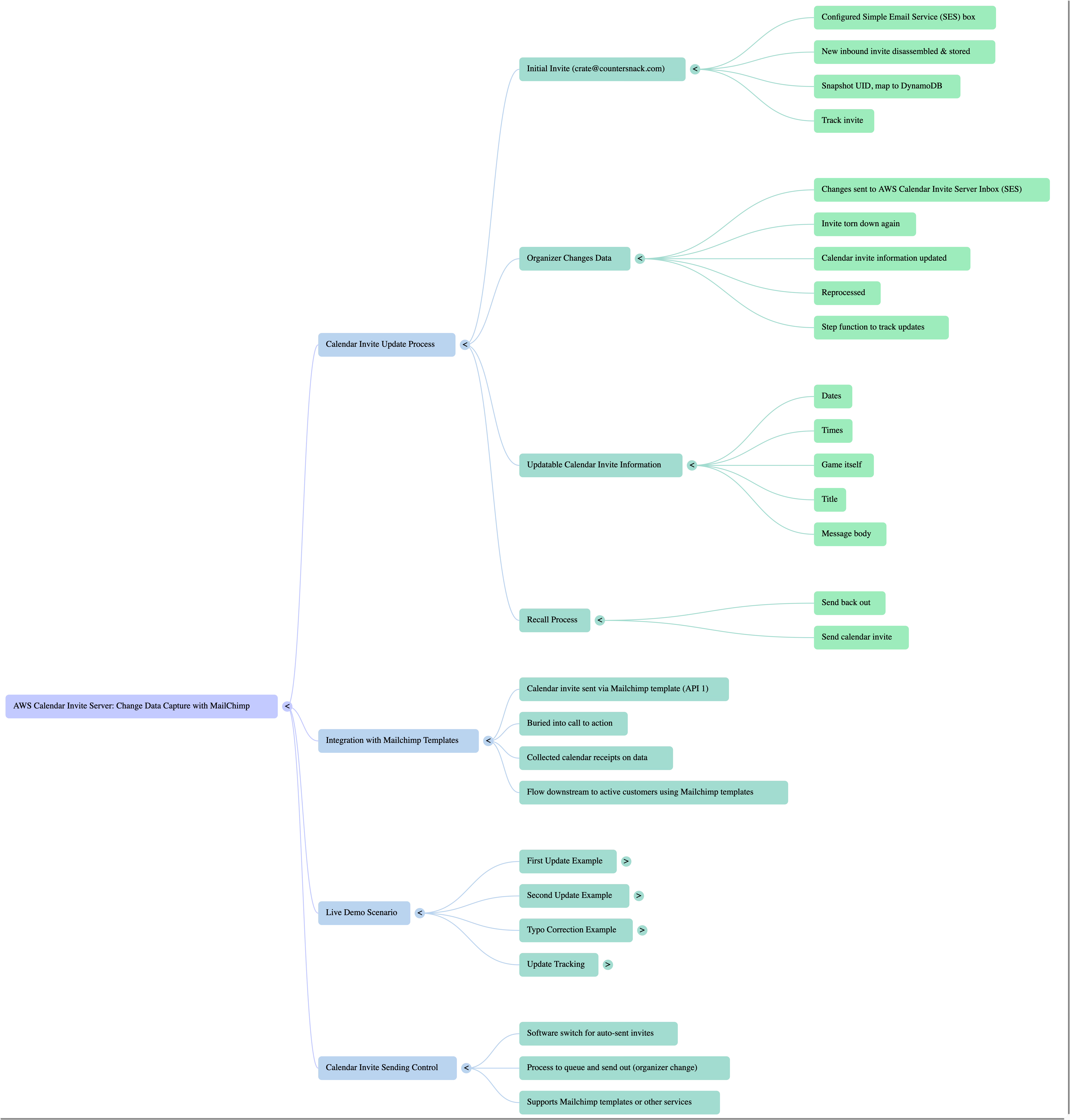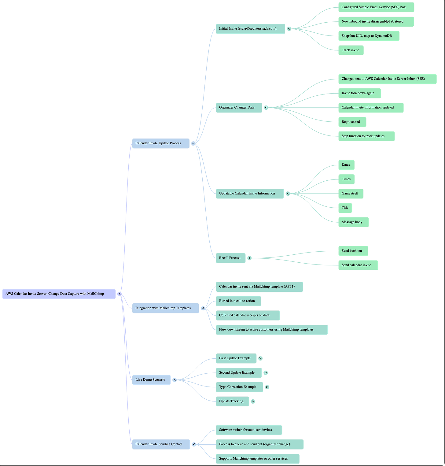 The system collects data from the counter snack app, which communicates with the AWS Calendar Invite Server. This data includes information about the initial invite, any updates made, and the number of events tracked. This data container keeps a record of all interactions and changes related to the calendar invites.
