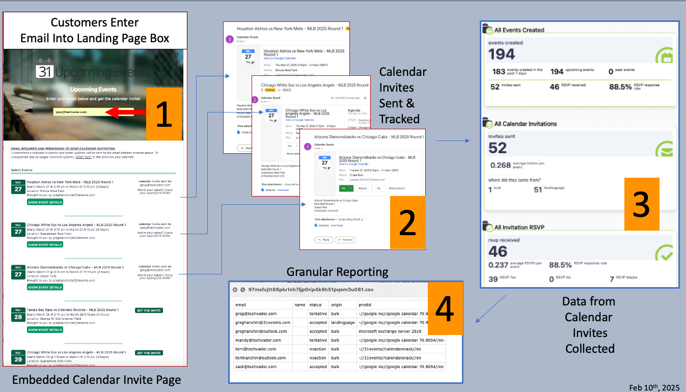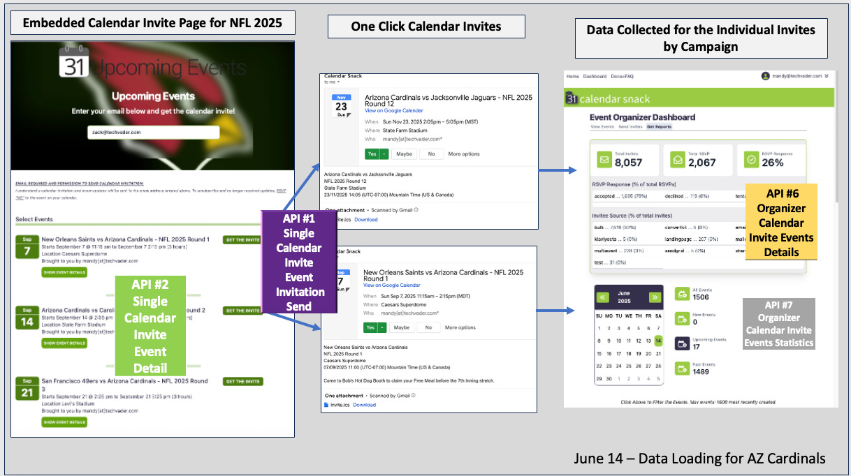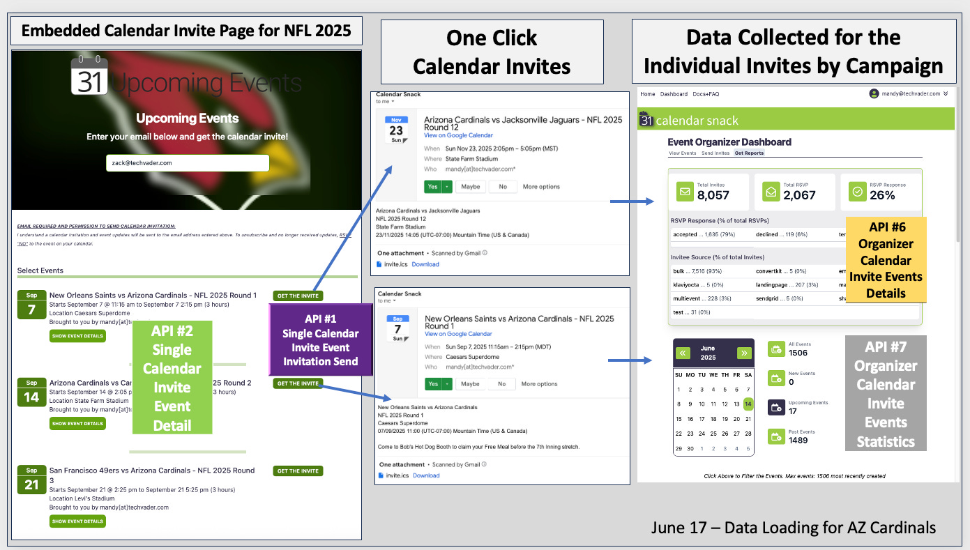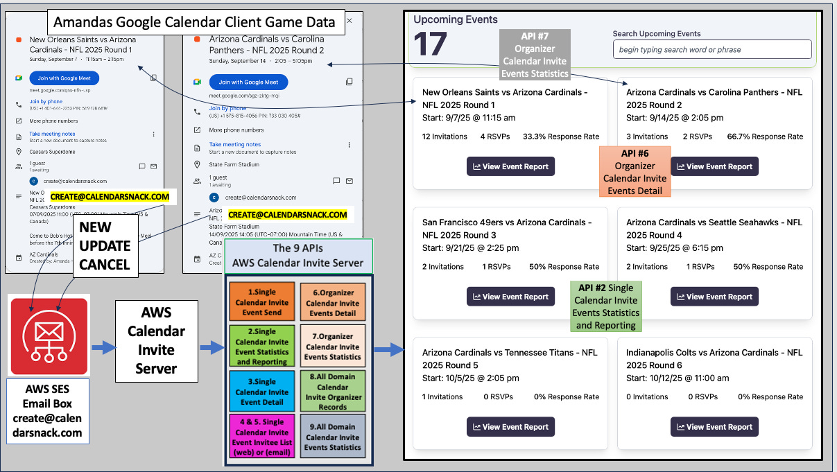 The Calendar Invite events stored in the AWS Calendar Invite Server are used in conjunction with the nine APIs built for sending calendar invites, collecting RSVP data, and providing reporting.