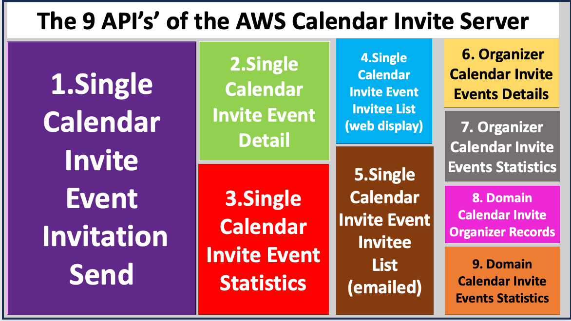 The Nine (9) APIs of the AWS Calendar Invite Server provide the ability to use AWS SES infrastructure to send millions of calendar invites for thousands of campaigns by building out applications with the powerful APIs and using the Leverage the Calendar Clients as powerful Campaign management for Tickets, Merch with making sure you get the Calendar Invite first.