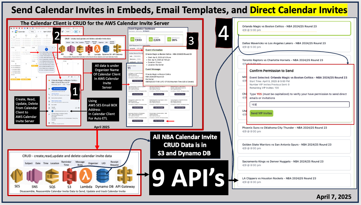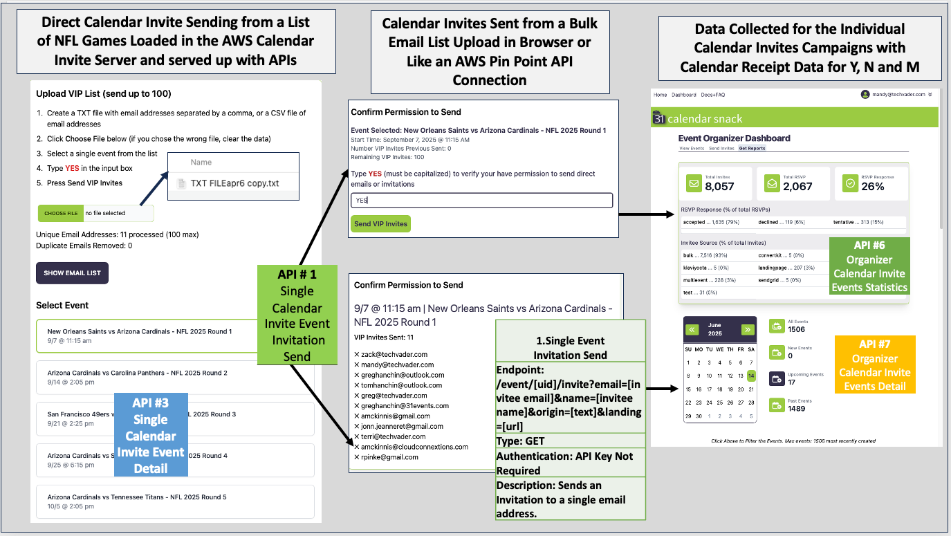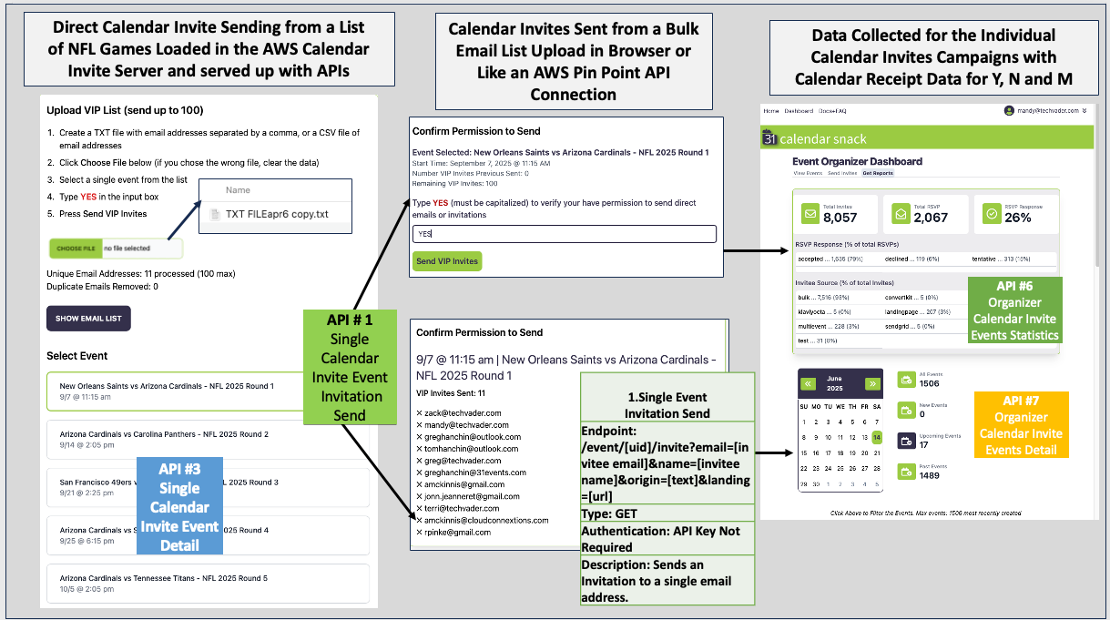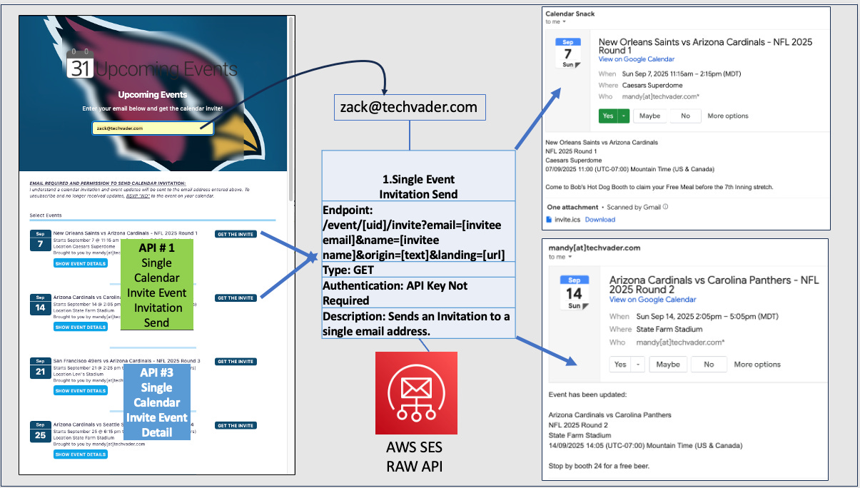 The Calendar Invite is sent using API #1 to the Email Address and then tracked for Calendar Receipts in the AWS Calendar Invite Server.