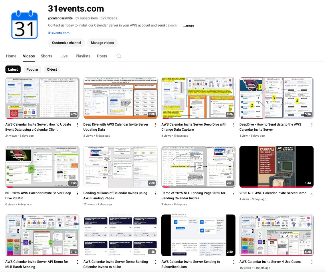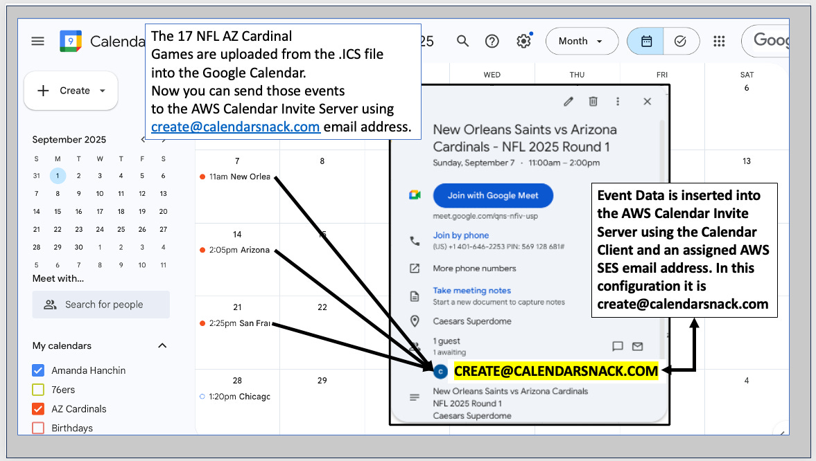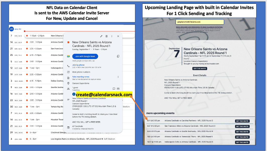 In this NFL game series, we utilize the sporting schedules from a calendar client and send the events to the AWS Calendar Invite Server to automatically process and store calendar invite events.