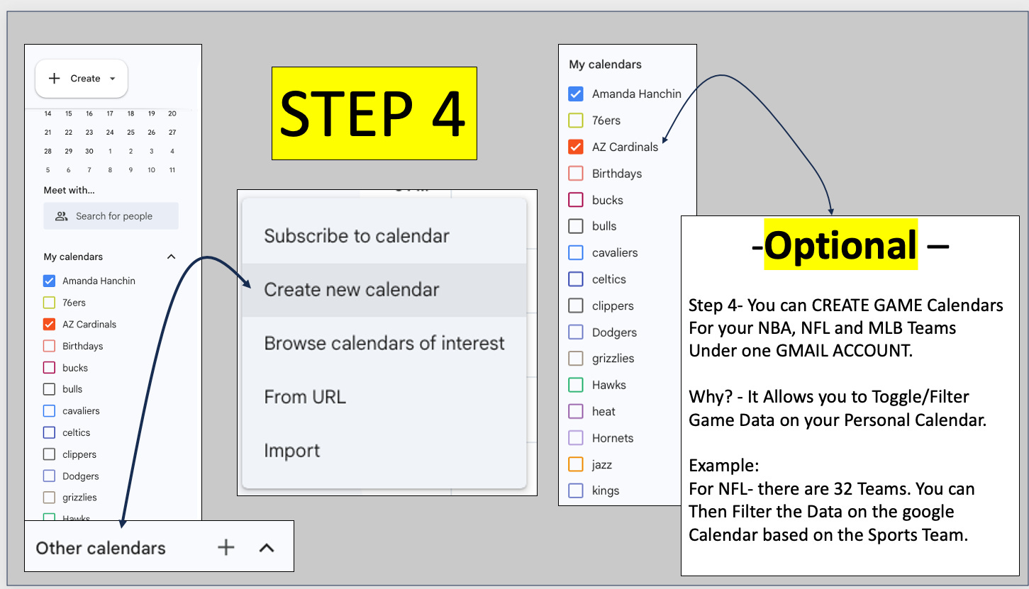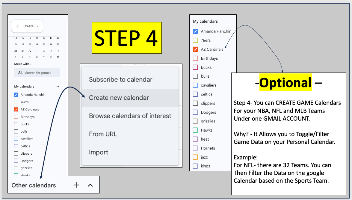 Step 4- You can CREATE GAME Calendars for your NBA, NFL, and MLB Teams Under one GMAIL or Outlook ACCOUNT.