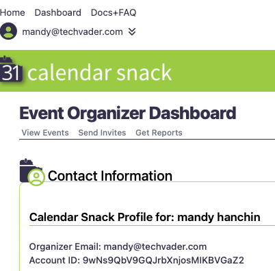 Anyone who sends a calendar invitation to the create@calendarsnack.com address will receive a notification back to the Organizers’ email address of the Calendar Client with instructions that the calendar invitation data has been processed and is available in the application interface to generate Upcoming event pages or send the Calendar Invite to a bulk list using the APIs.