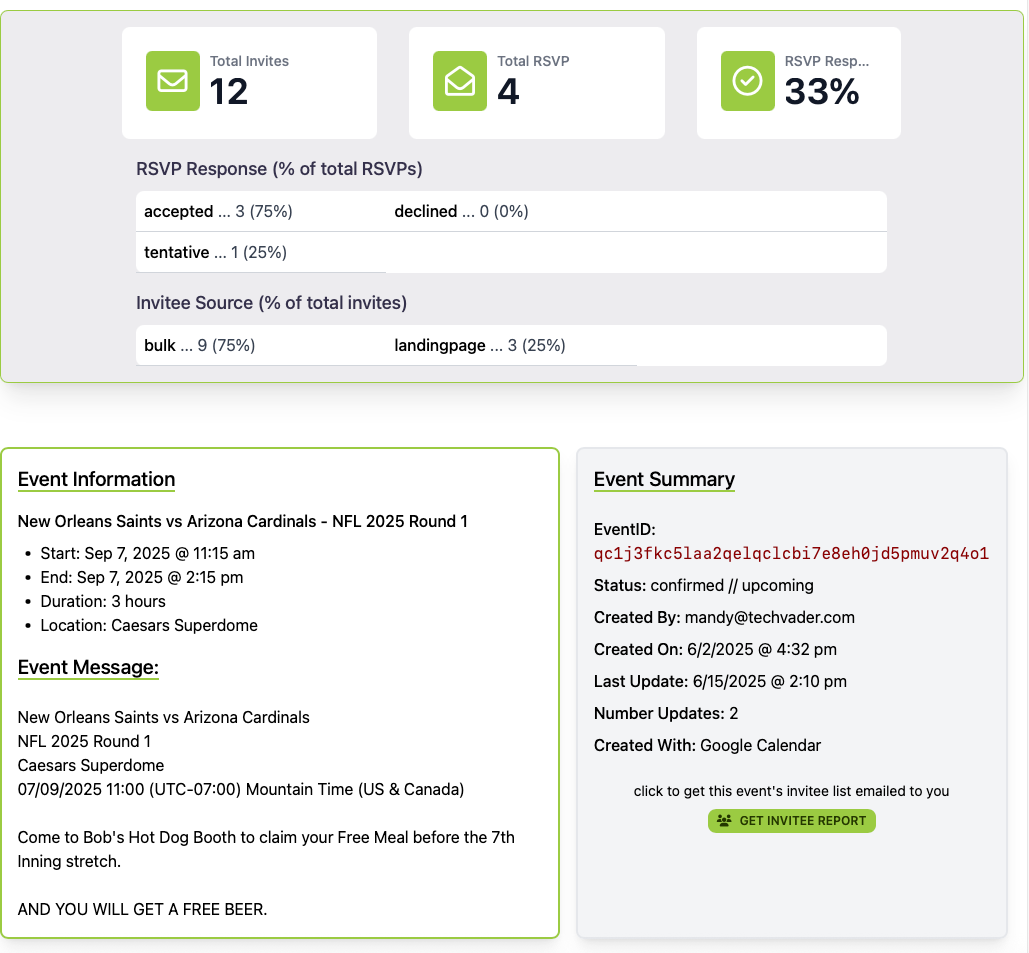 In the Example below: mandy@techvder.com is the Organizer that we review in this blog post for NFL 2025 data.