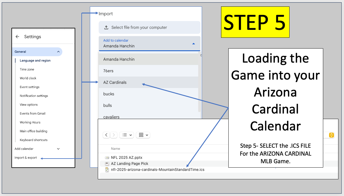 Loading the Game into your Arizona Cardinal Calendar. Step 5- SELECT the ICS FILE for the ARIZONA CARDINALS NFL Game.