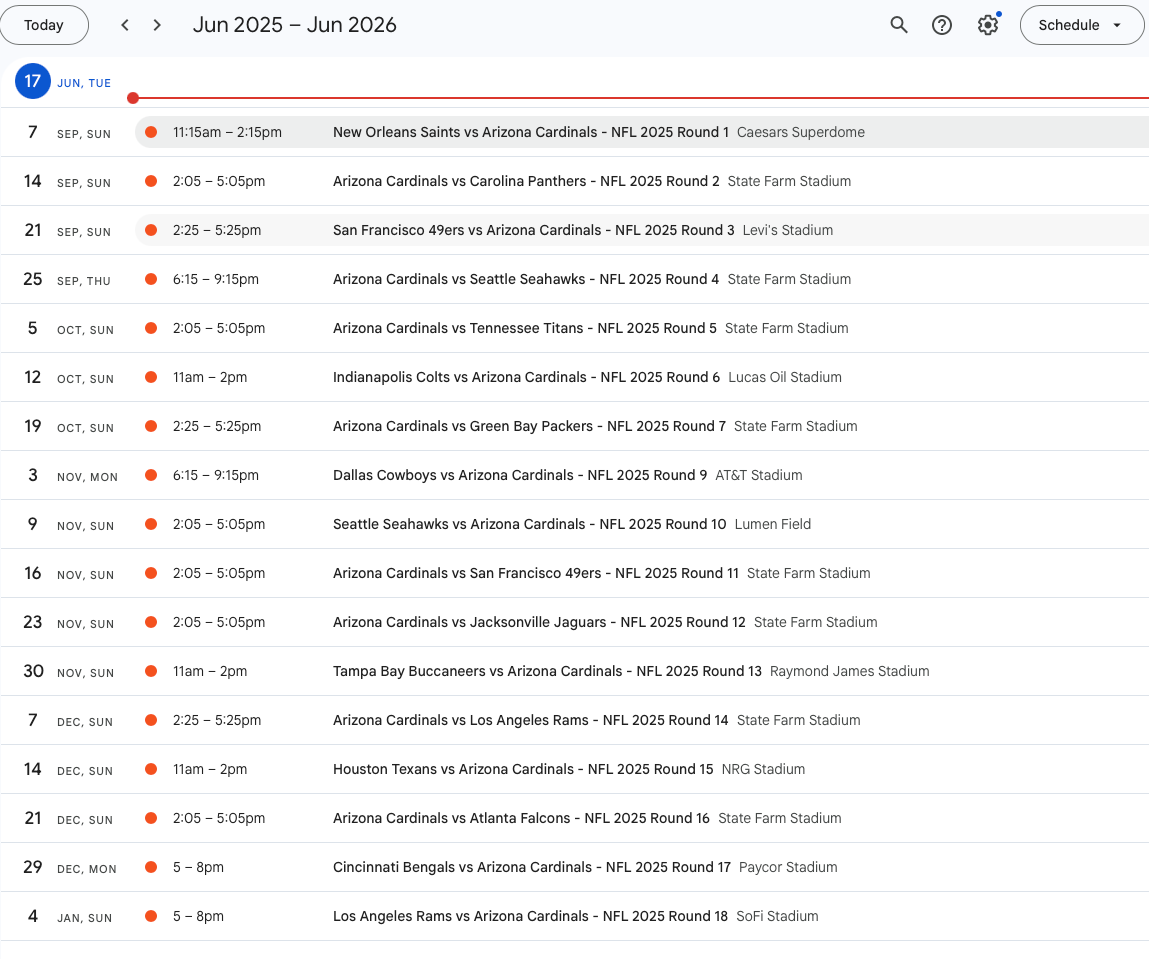 Schedule View of the AZ Cardinals loaded onto Google Calendar