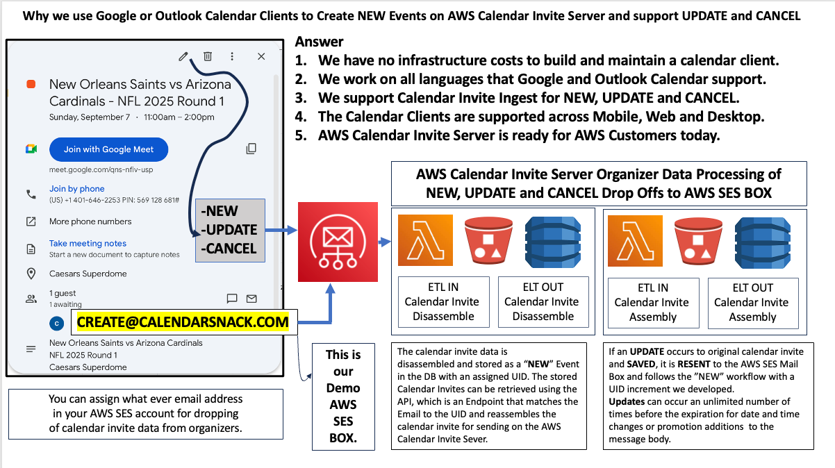 The AWS SES-configured email box is where all AWS calendar invite server processing begins for new, updated, and canceled events.