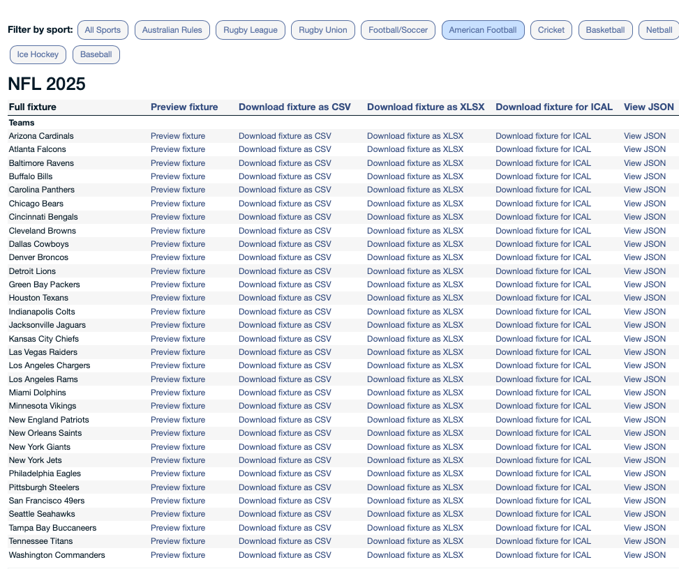 The games are loaded onto an organizer’s calendar client using the ICAL Files from a global sporting site called Fixture Downloads for ICAL Game Data.