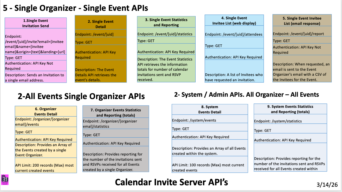 This REST API is a multi-purpose API used to SEND Calendar Invites for RSVP Buttons (e.g., Mailchimp), embed Calendar Invites in Sports Schedule Web Pages, and embed the API in a GUI Picker for selecting and sending Calendar Invites to a bulk email List.