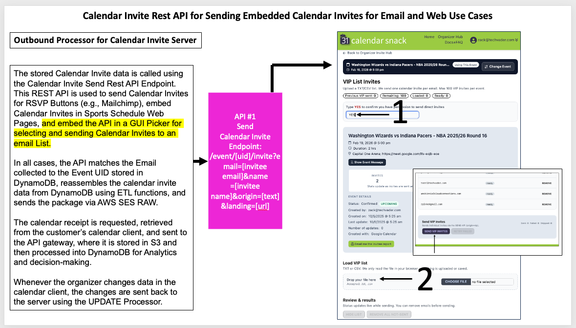 The button triggers the OUTBOUND processor, which houses the Lambda Logic and workflow for the REST API that packages the Calendar Invite UID data, sends a correct Calendar invite via the AWS SES RAW API to each email address on the list, and REQUESTS a calendar receipt for tracking back to the API gateway.