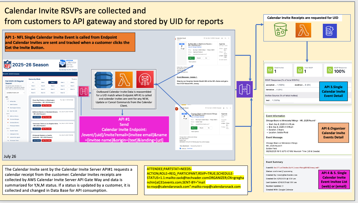 In all use cases, the API matches the Email collected to the Event UID stored in DynamoDB, reassembles the calendar invite data from DynamoDB using ETL functions, and sends the package via AWS SES RAW.