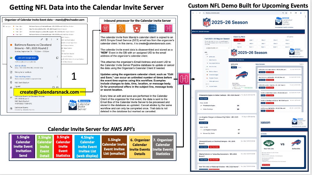 Event Creation & Virtualization The process begins by modeling a complete event within the system. For example, an NFL game is defined with all its core attributes—participating teams, date, kickoff time, and venue. This event is then “virtualized” within CIS, creating a ready-to-distribute, standards-compliant calendar invitation.