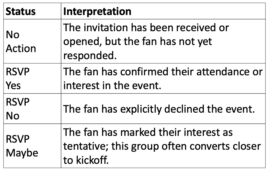 Every invitation sent through CIS generates a first-party record that is directly tied to the recipient. The system then tracks the real-time RSVP status, updating the record whenever the fan changes their response. This capability transforms the calendar from a static information repository into a live feedback loop. The system tracks four key statuses, each providing a unique insight into fan intent: