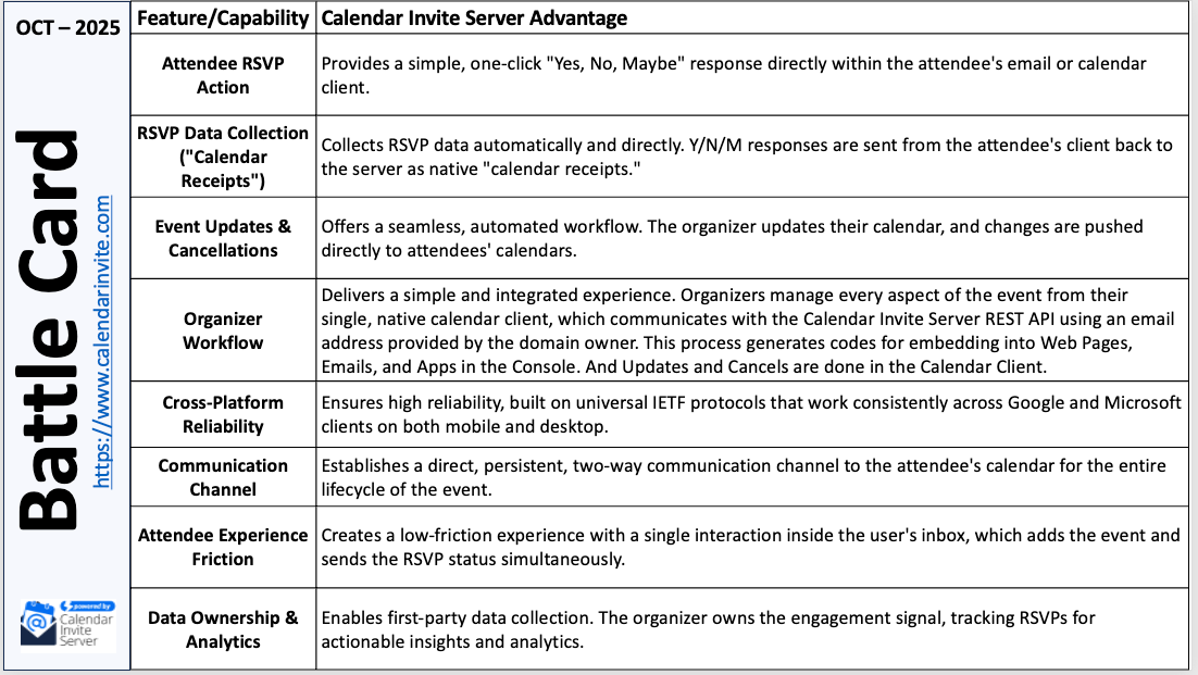 This section clearly articulates the unique value and defensible competitive advantages of the Calendar Invite Server. The primary comparison is not with another software product, but with the inefficient, fragmented, and unreliable legacy workflow that currently dominates the market. CIS establishes a new, superior standard for event-based communication by directly addressing every failure point of the incumbent method.