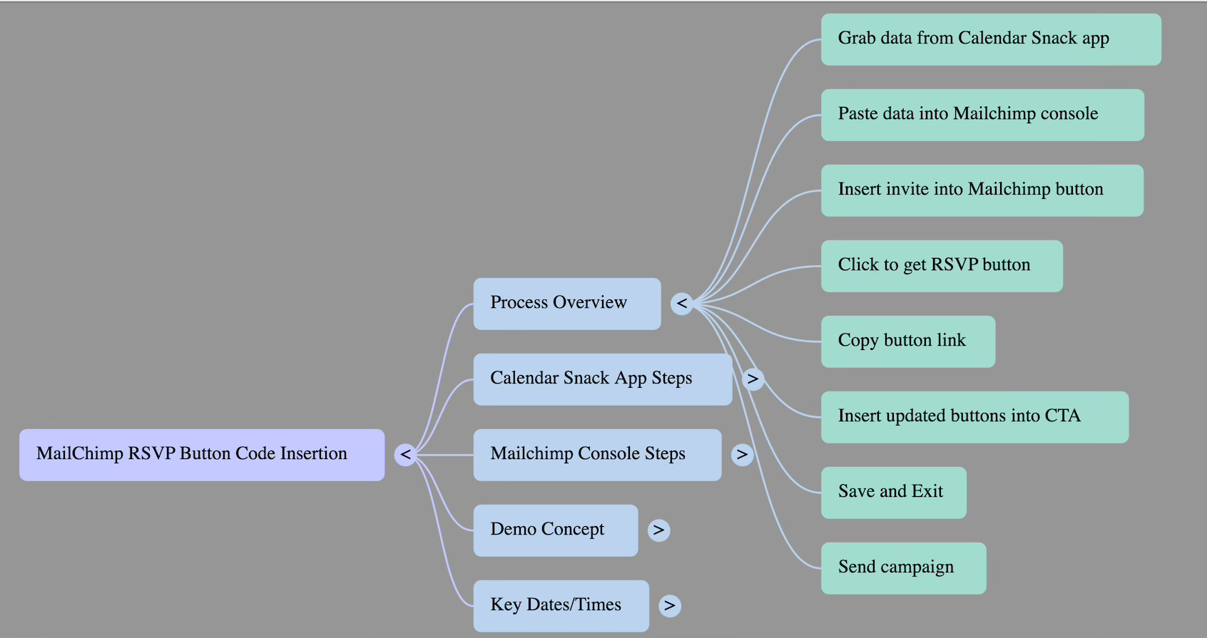 This briefing summarizes the process of integrating Calendar Snack-generated RSVP buttons with MailChimp campaigns, focusing on event promotion and attendee tracking. The primary goal is to provide a "quick and dirty calendar invite insert" into MailChimp calls to action, allowing recipients to add events to their calendars easily and enabling the sender to track these interactions and send updates directly to the customer’s calendar.